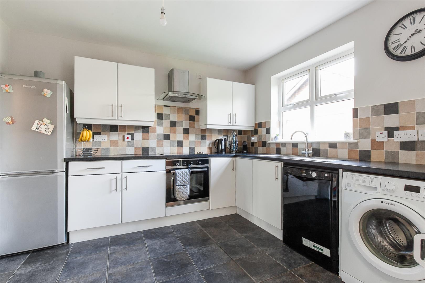 Modern fitted kitchen with range of high and low level storage units with contrasting granite effect melamine work surface. Stainless steel sink unit with draining bay. Integrated ceramic hob with stainless steel extractor hood over. Integrated oven. Space for fridge freezer. Plumbed and space for washing machine and dishwasher. Splashback tiling to walls. Tiled floor.