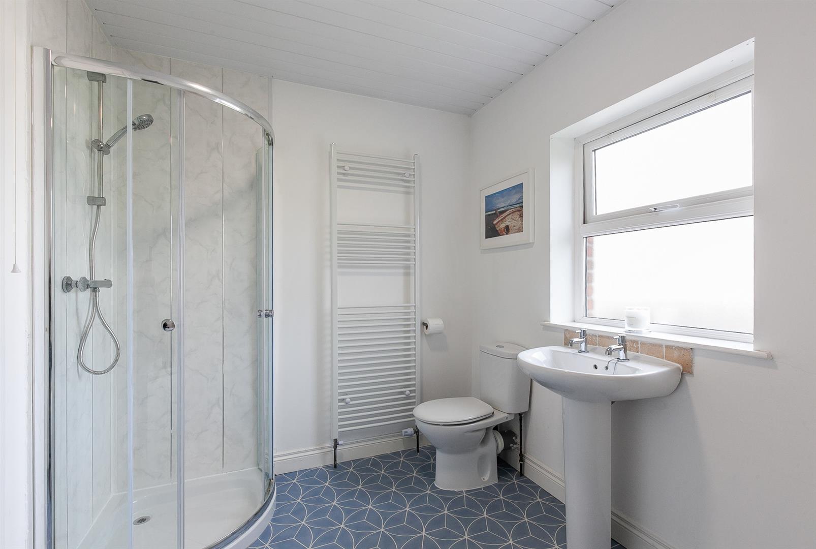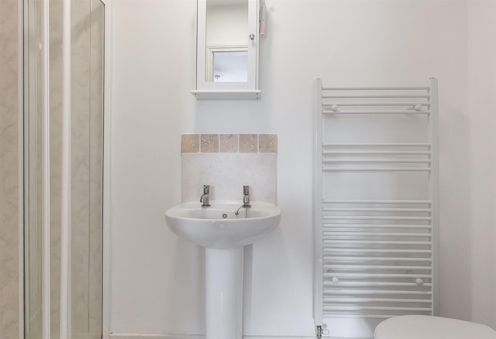 White, three piece suite comprising panelled shower, pedestal wash hand basin and WC. Thermostat controlled main shower unit. Splashback tiling to sink. Towel radiator. Tiled floor.