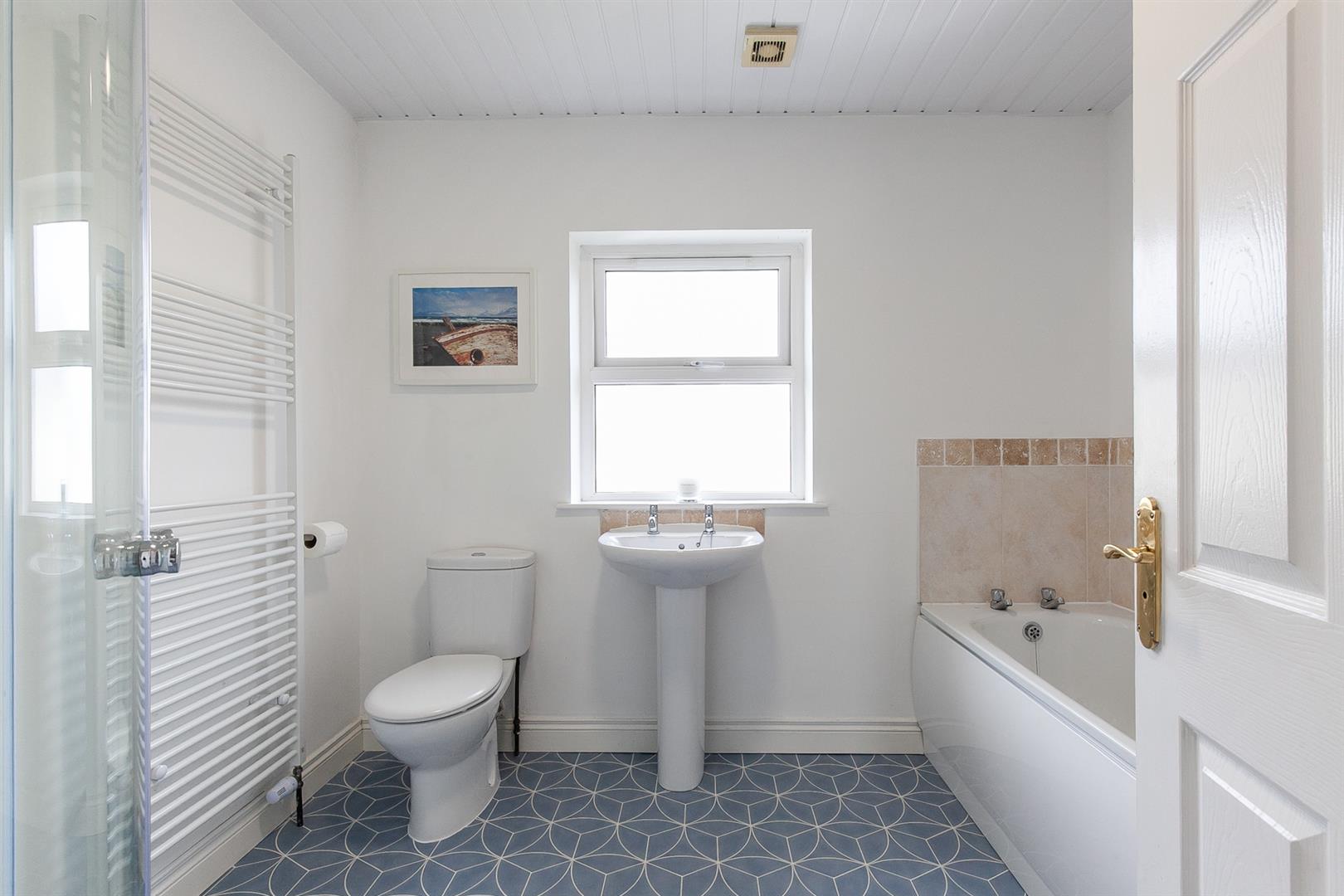 White, four piece suite comprising panelled bath, separate shower enclosure, pedestal wash hand basin and WC. Splashback tiling to walls. Thermostat controlled main shower unit. Towel radiator.