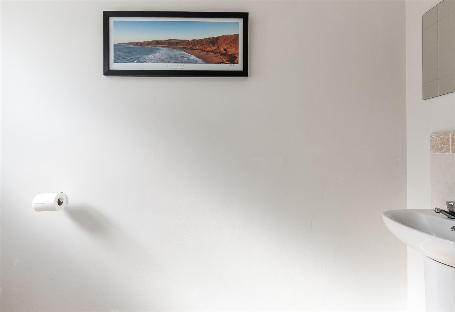 White, two piece suite comprising wash hand basin and WC. Splashback tiling to sink. Wood laminate floor covering.