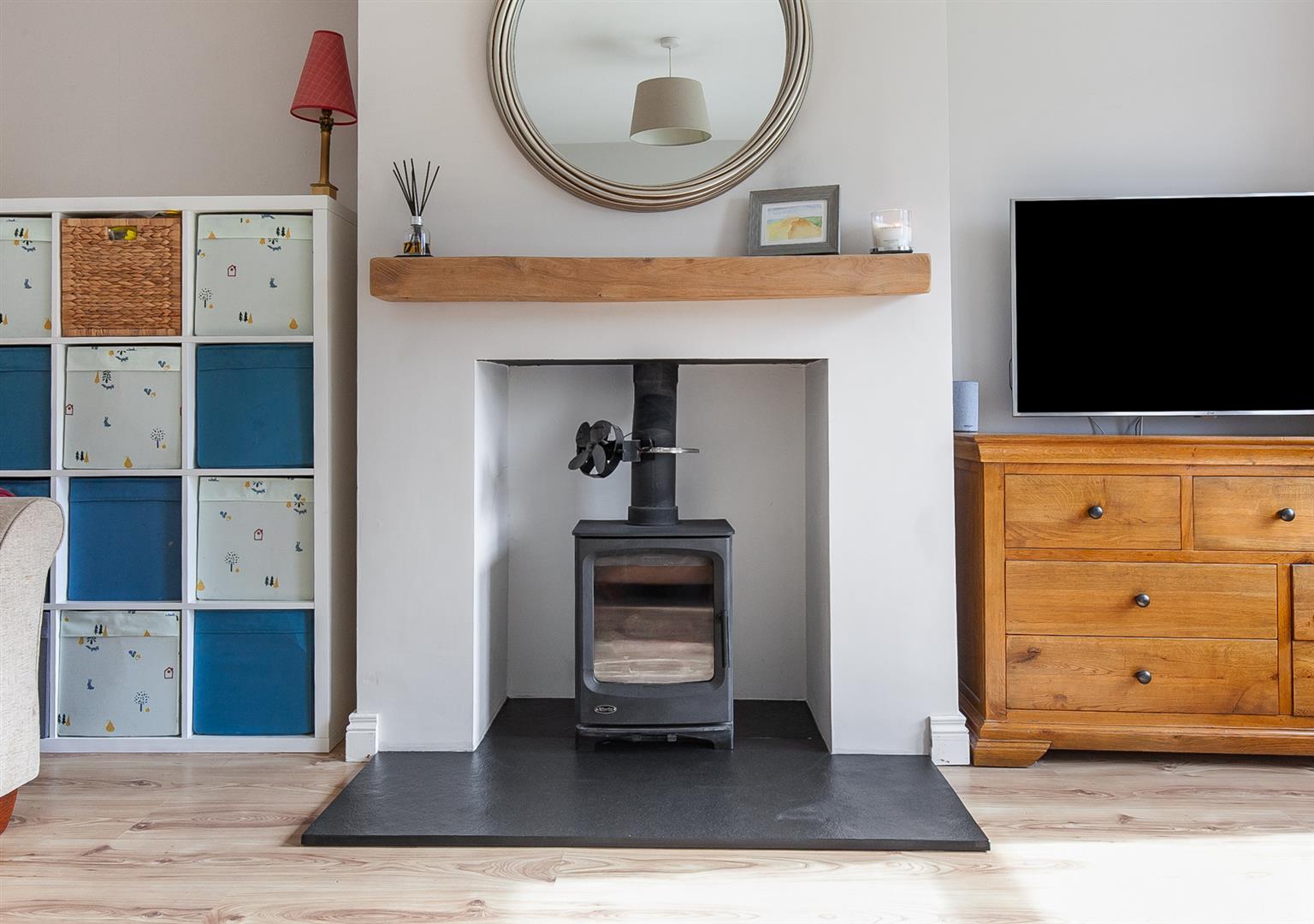 Cast iron, wood burning stove on slate hearth. Wood laminate floor covering.