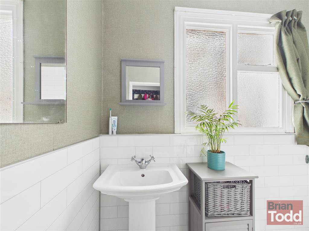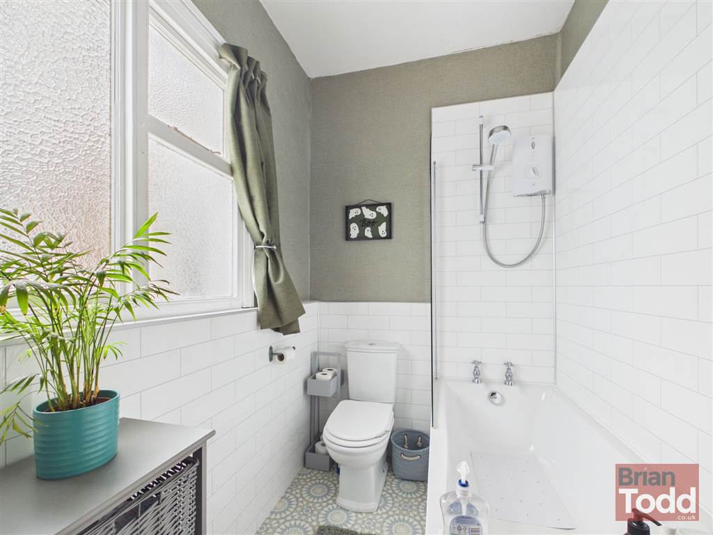 Recently installed white suite with RAK ceramics. Traditional "Washington" push button W.C., pedestal wash hand basin with Victorian style chrome taps, and bath with "MIRA SPORT AIRBOOST" electric shower and screen. Wall tiling.