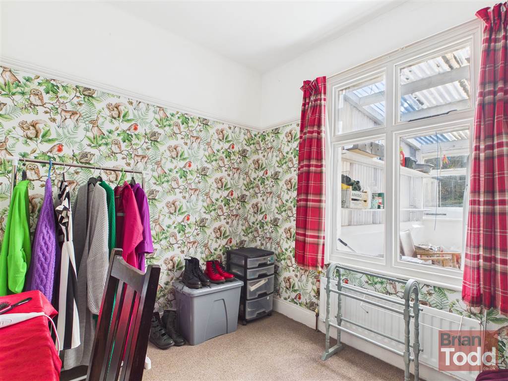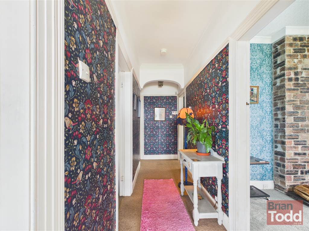 Externally, the property is complemented by a generous rear garden laid in lawn, a walled front garden also in lawn, a detached garage and a long tarmac driveway providing ample parking for several vehicles.