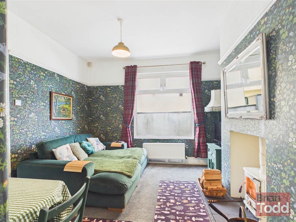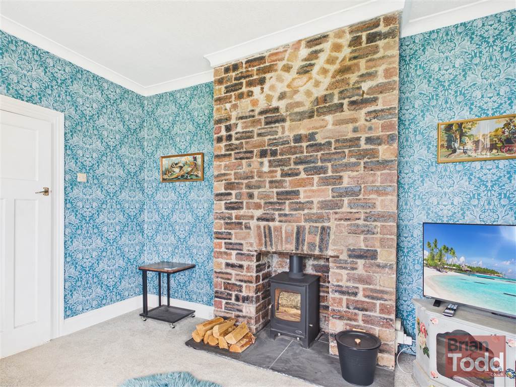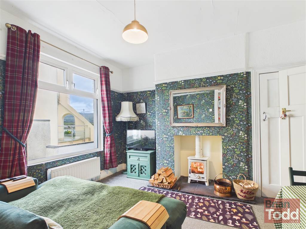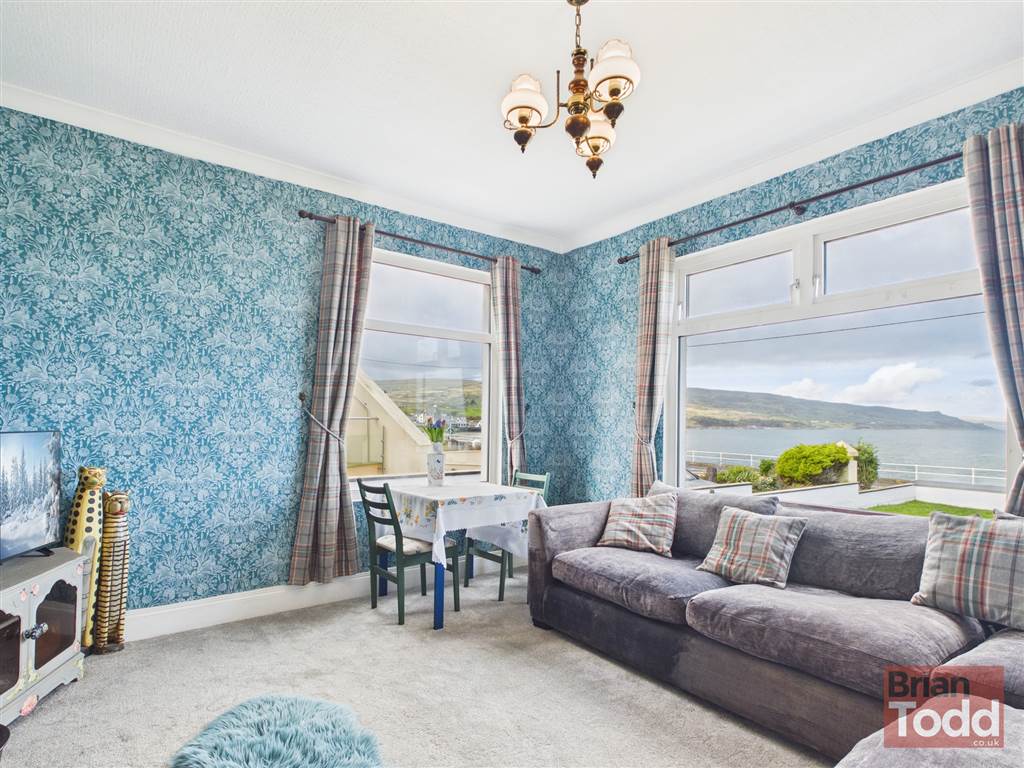 Feature brick wall fireplace with "HenlySherwood" Eco multifuel burning stove.Decorative coved ceiling. Twin windows, which afford panoramic views to the North Channel, Glens of Antrim, surrounding area and Scotland.
