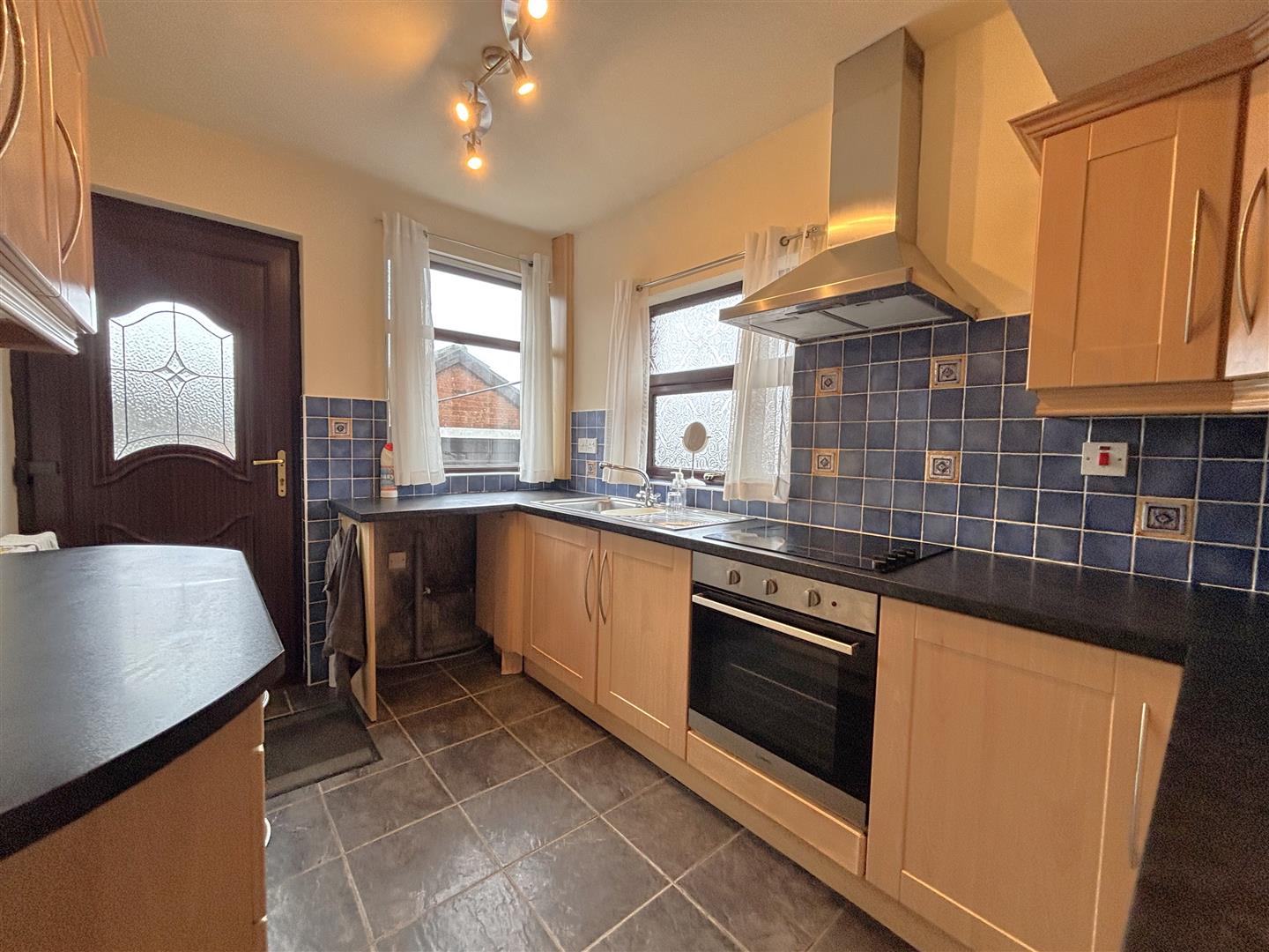 Bowl and 1/2 stainless steel sink unit, range of high and low level units, formica worktops, built-in under oven and ceramic hob, stainless steel canopy extractor fan, integrated under fridge, plumbed for washing machine, partly tiled walls, double panelled radiator, uPvc door to rear.