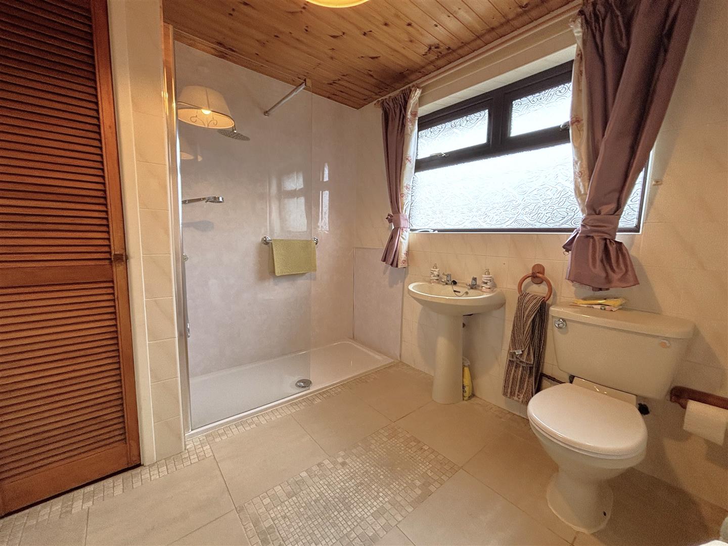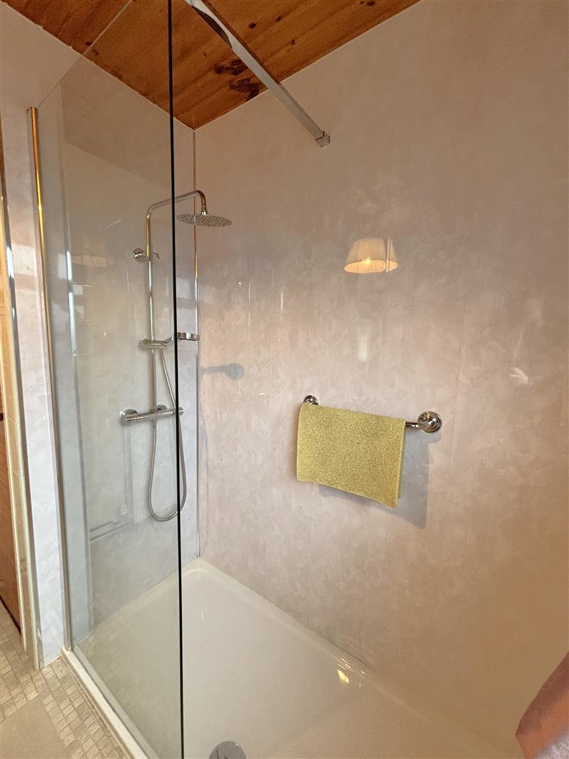 Contemporary cream bathroom suite comprising walk-in shower, thermostatically controlled drench shower, telephone hand set, pedestal wash hand basin, low flush wc, partly tiled walls, part pvc panelled walls, double panelled radiator, ceramic tiled floor, pine tongue and groove ceiling, built-in storage, concealed gas boiler.