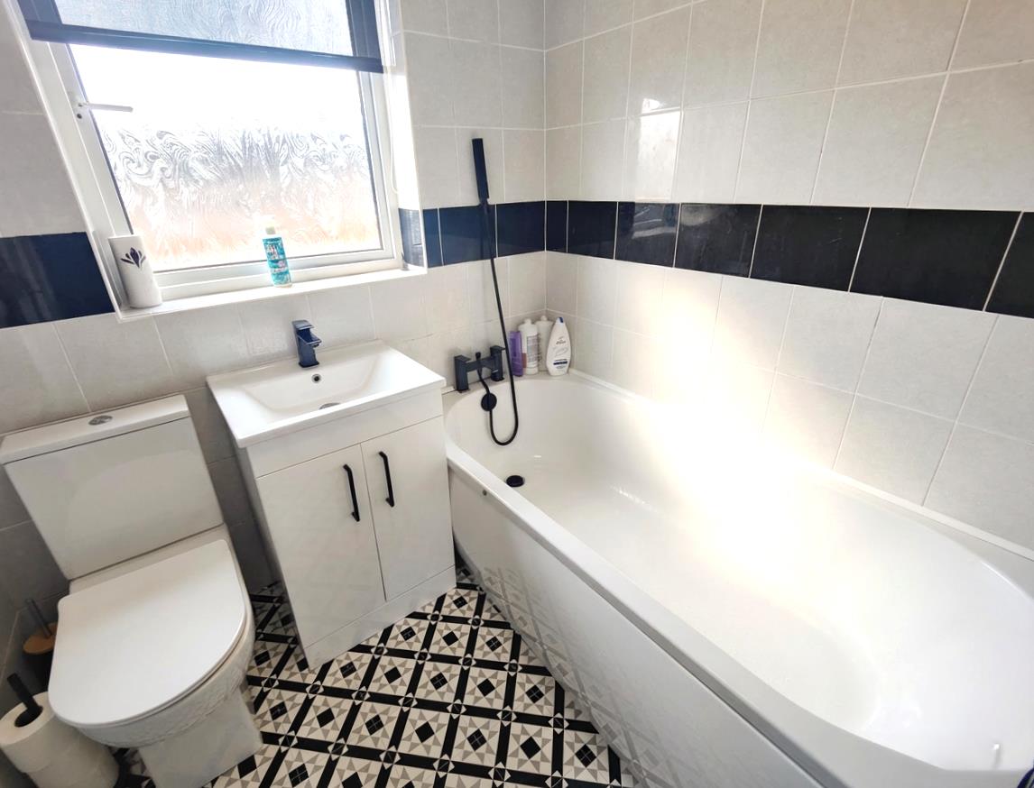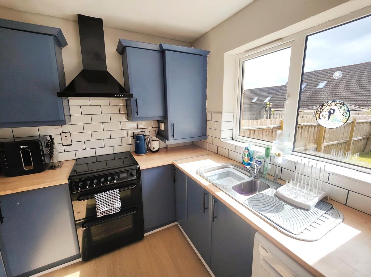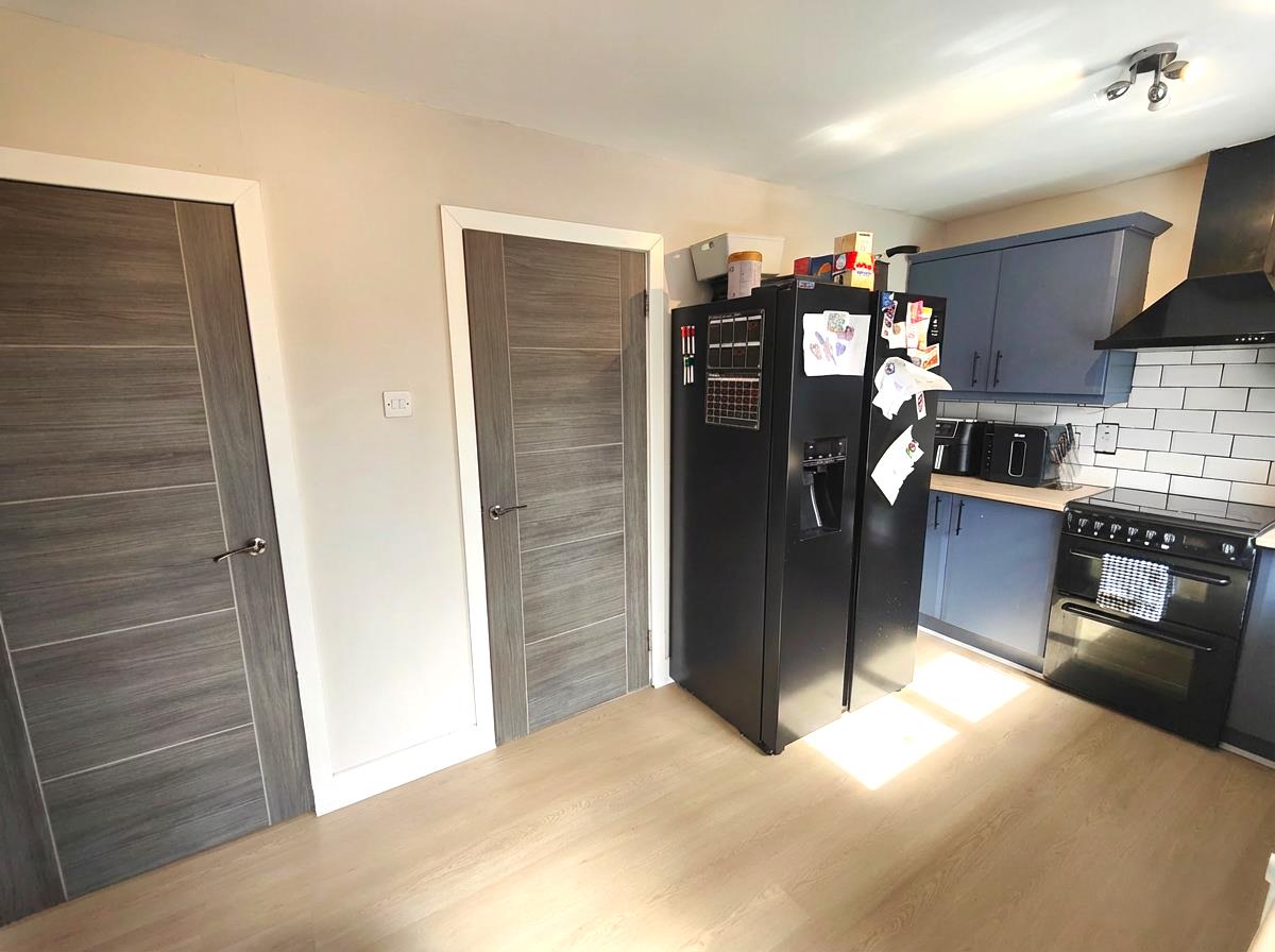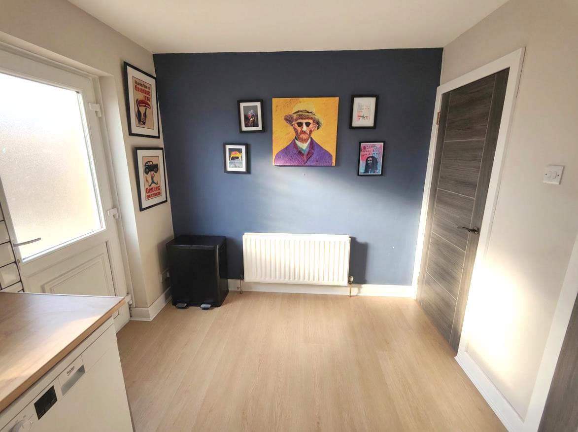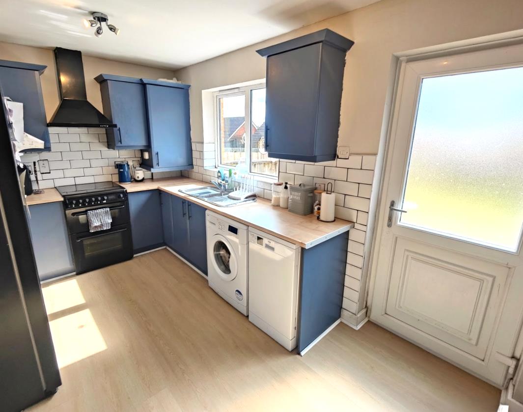 Bowl and a half single drainer stainless steel sink unit, extensive range of high and low level units, formica worktops, cooker space, extractor fan, fridge/freezer space, plumbed for washing machine, plumbed for dishwasher, concealed gas boiler, partly tiled walls, wood laminate floor, double panelled radiator, understairs storage, uPvc rear door.