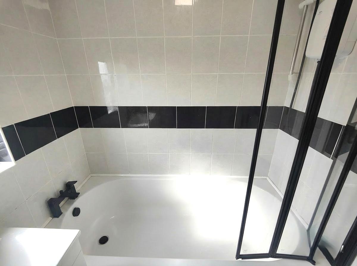 Modern white suite comprising panelled bath, telephone hand shower, electric shower, vanity unit, low flush wc, chrome radiator, fully tiled walls.