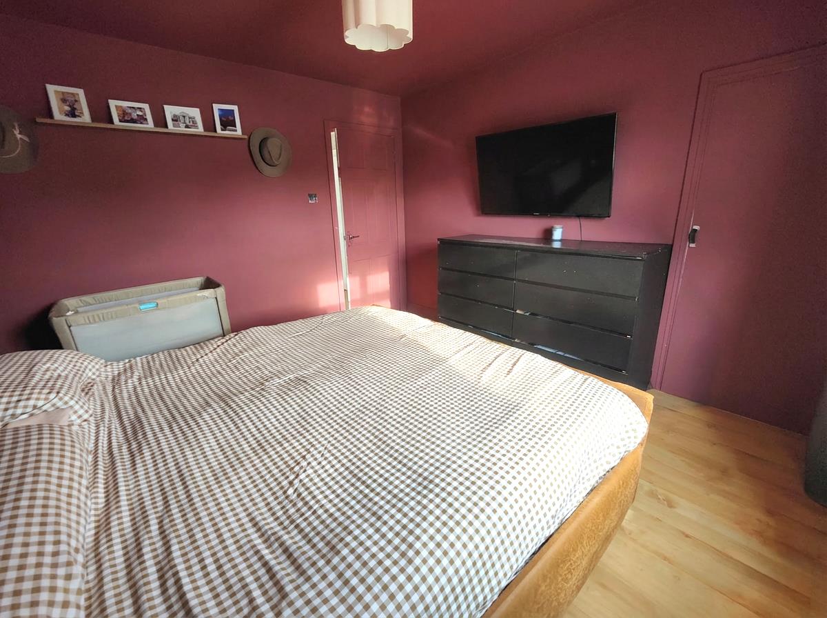 Wood laminate floor, cornice ceiling, panelled radiator.