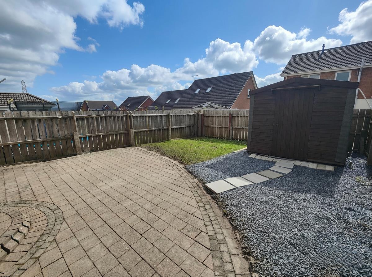 Gardens front and rear in mature lawn, feature brick paved driveway and patio area, garden shed.