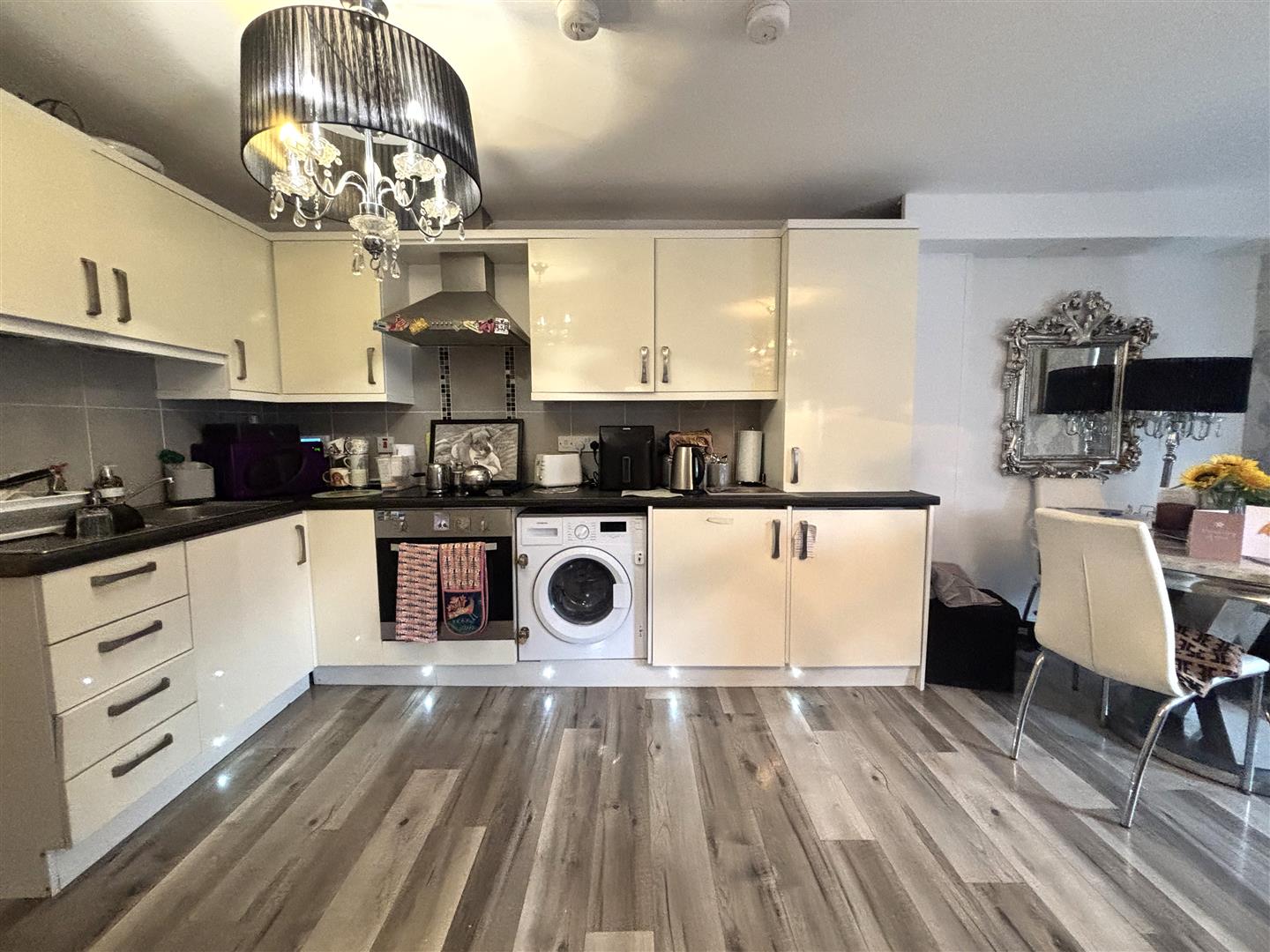 Bowl and a half single drainer stainless steel sink unit, range of high and low level units, formica worktops, built-n under oven and ceramic hob, stainless steel canopy extractor fan, integrated under fridge, integrated under freezer, integrated washing machine, concealed gas boiler.