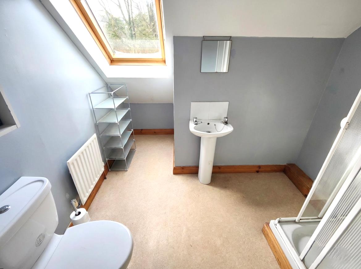 White bathroom suite comprising shower cubicle, pedestal wash hand basin, low flush wc, panelled radiator, velux window, extractor fan.