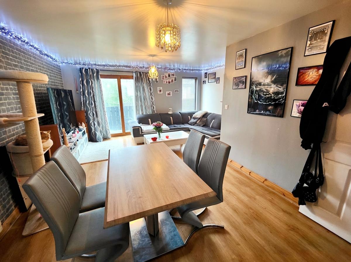 Wood laminate floor, double panelled radiator, understairs storage, uPvc slide door, informal dining.