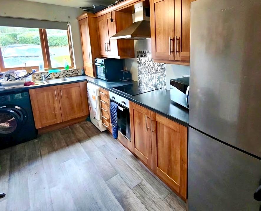 Bowl and 1/2 stainless steel sink unit, extensive range of high and low level units, formica worktops, built-in under oven, ceramic hob, stainless steel canopy extractor fan, fridge/freezer space, tumble dryer space, plumbed for washing machine, partly tiled walls, concealed gas boiler, double panelled radiator.