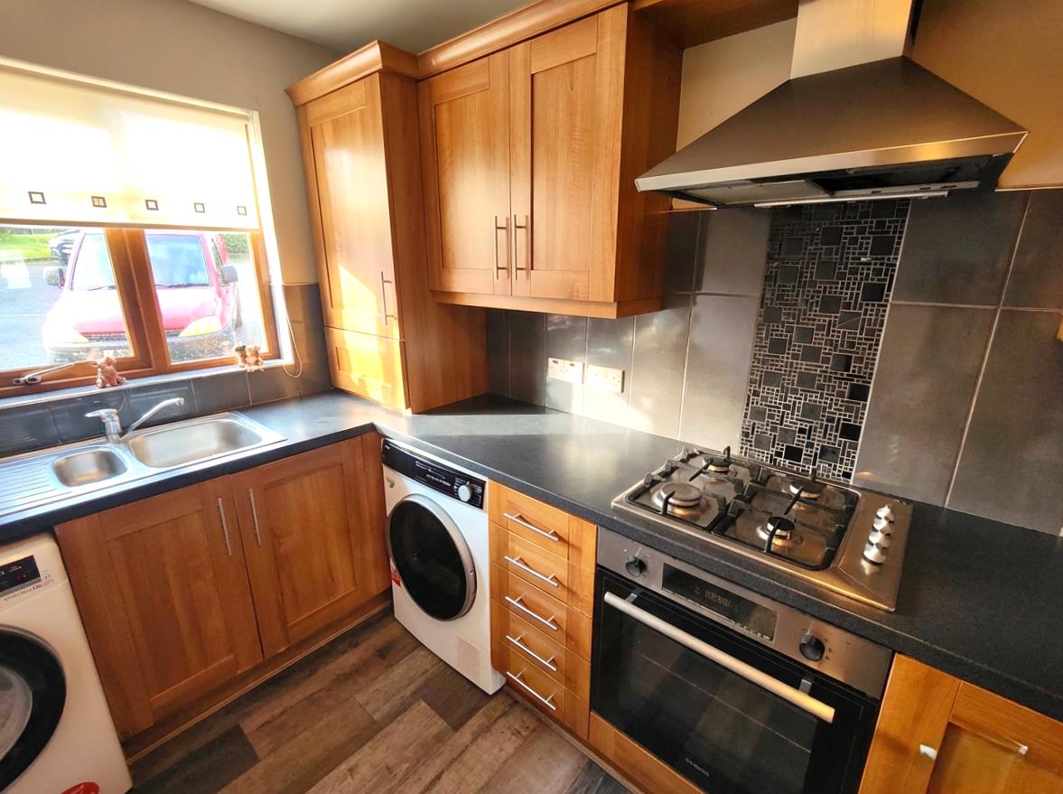 Bowl and 1/2 stainless steel sink unit, extensive range of high and low level units, formica worktops, built-in under oven, gas hob, stainless steel canopy extractor fan, fridge/freezer space, plumbed for washing machine, tumble dryer space, double panelled radiator, wood laminate floor, concealed gas boiler.