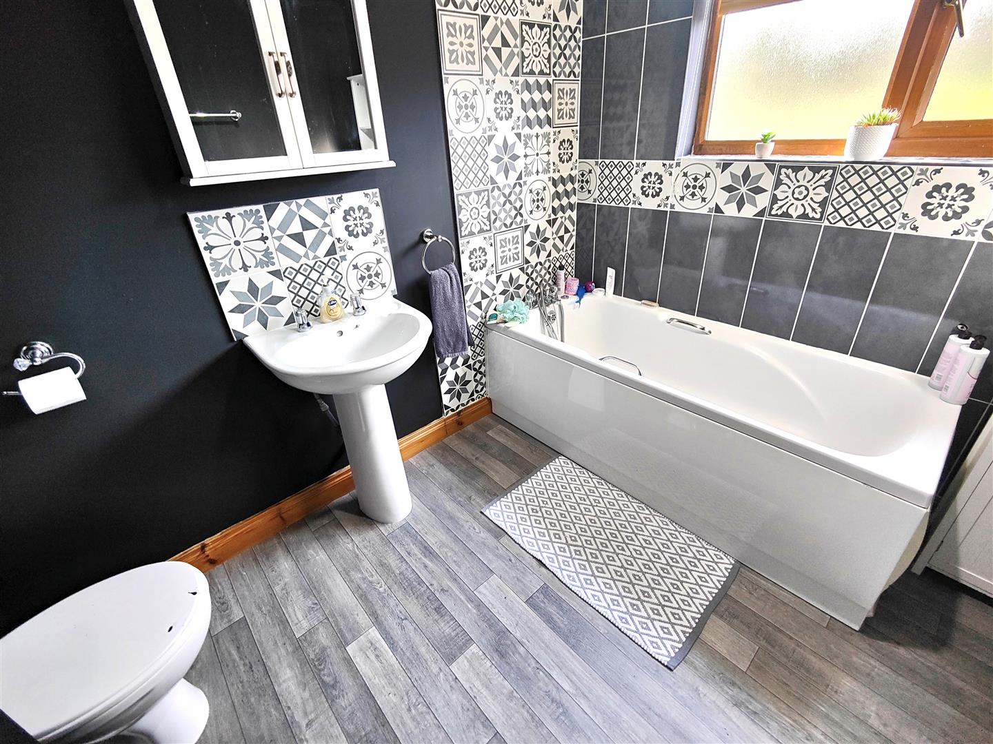 Modern white bathroom suite comprising panelled bath, pedestal wash hand basin, low flush wc, double panelled radiator, partly tiled walls, extractor fan.