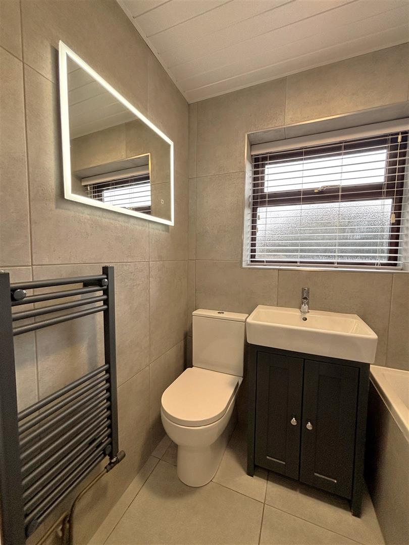 Single drainer stainless steel sink unit, range of high and low level unit, formica worktops, built-in high level oven, induction hob, integrated microwave, integrated fridge/freezer, integrated dishwasher, partly tiled walls, ceramic tiled floor, double panelled radiator, recessed lightin, uPvc rear door.