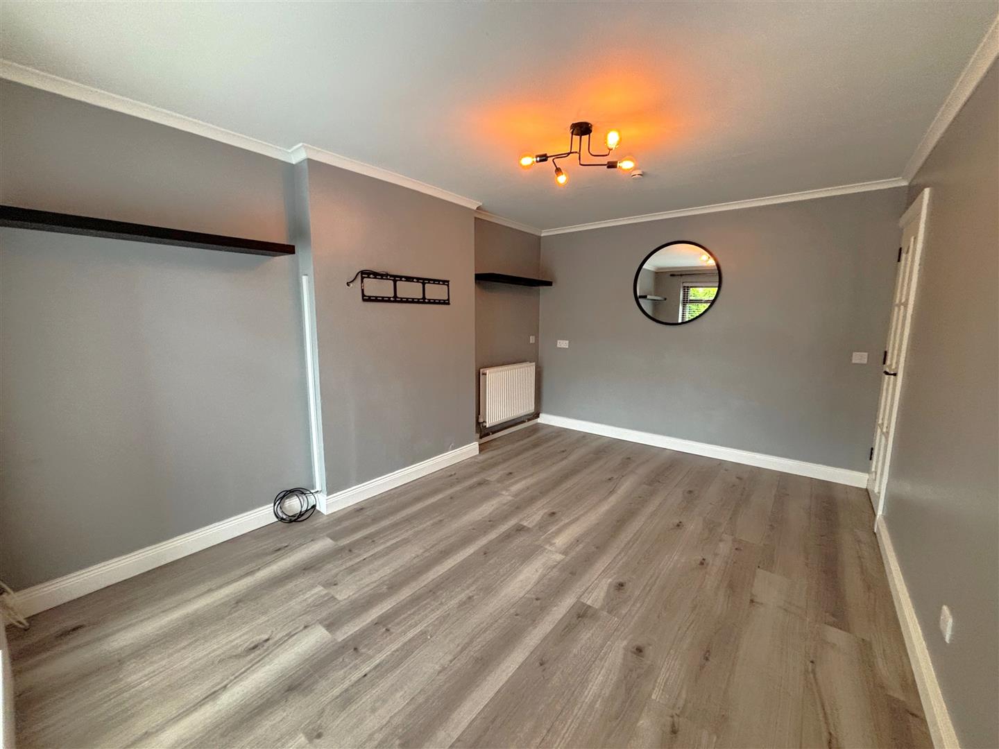 Wood laminate floor, double panelled radiator, partly panelled walls, recessed lighting.