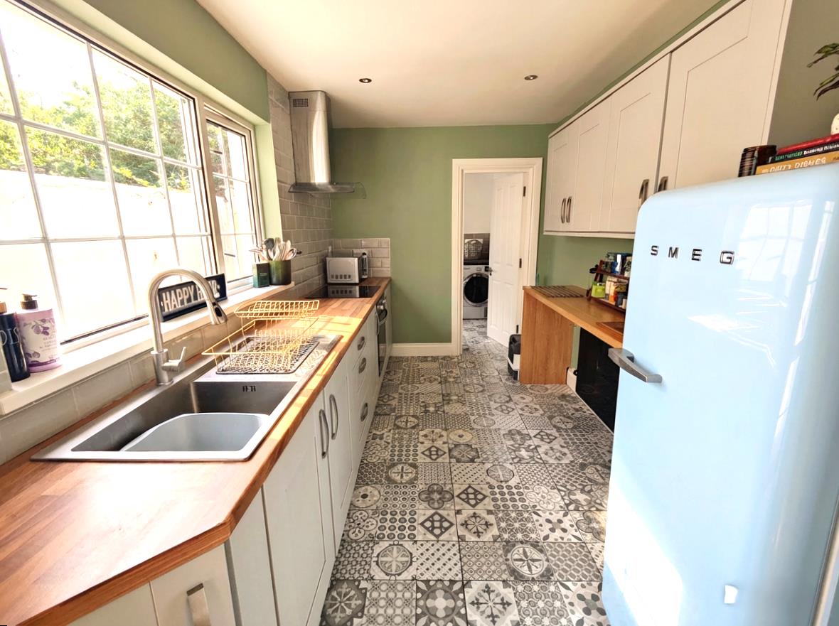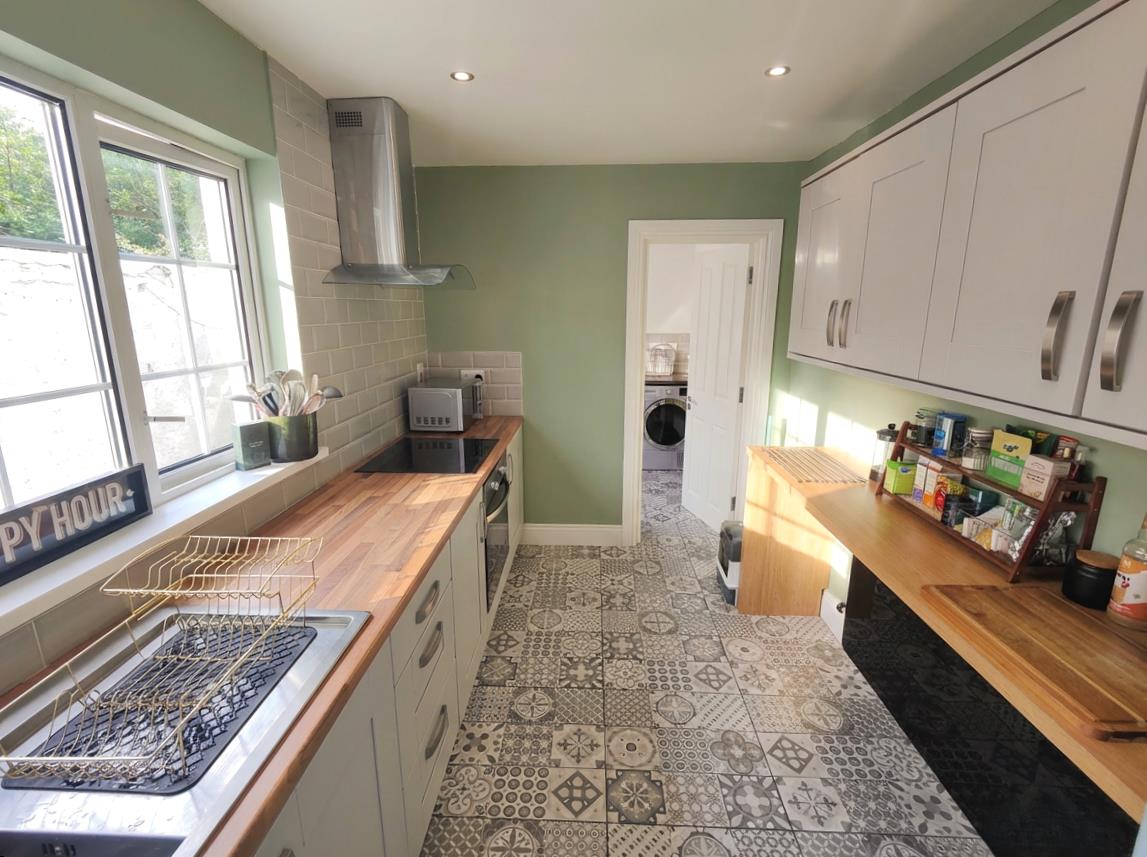 Single drainer stainless steel sink unit, extensive range of high and low level units, formica worktops, built-in under oven and ceramic hob, stainless steel canopy extractor fan, breakfast bar, fridge/freezer space, partly tiled walls, ceramic tiled floor, panelled radiator, recessed lighting, understairs storage with power, upvc double glazed rear door.