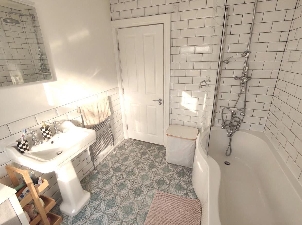 Modern white bathroom suite comprising panelled bath, shower screen, thermostatically controlled drench shower, traditional high level victorian wc, pedestal wash hand basin, feature radiator, partly tiled walls, ceramic tiled floor, recessed lighting.