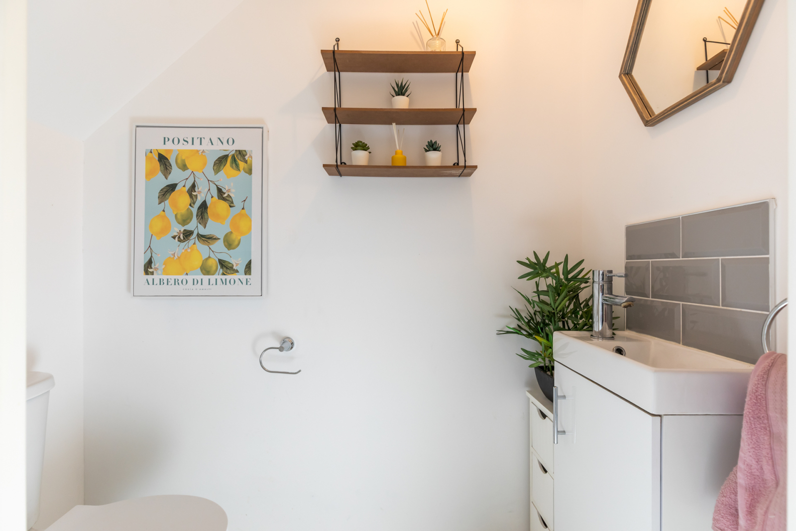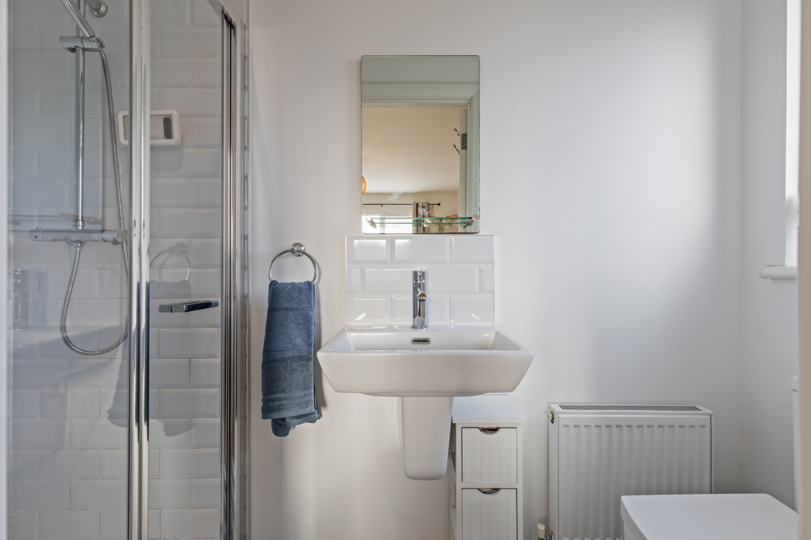 Comprises of enclosed shower unit with shower screen and tiled walls. Ceramic bowl sink unit with mixer tap and tiled splash back. Low flus WC, tiled floor and recessed lighting and extractor fan.