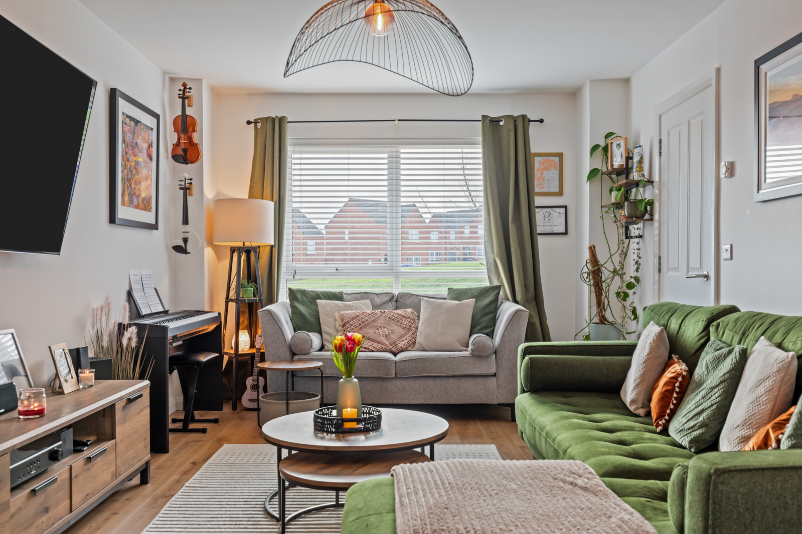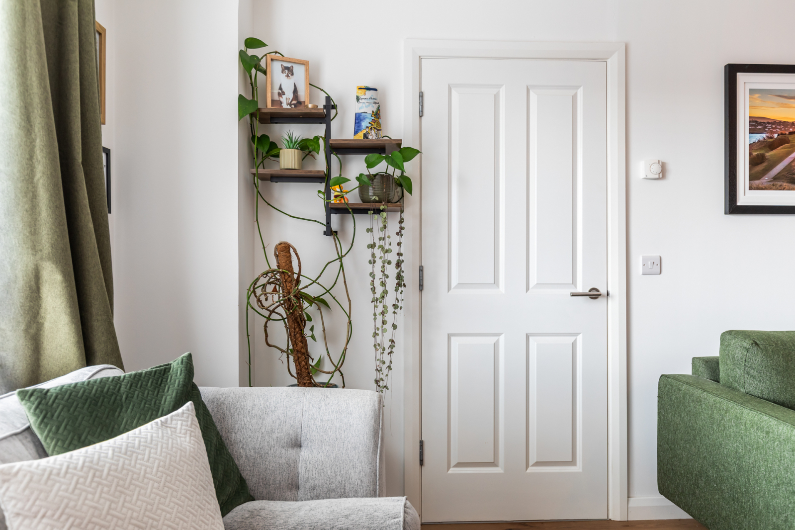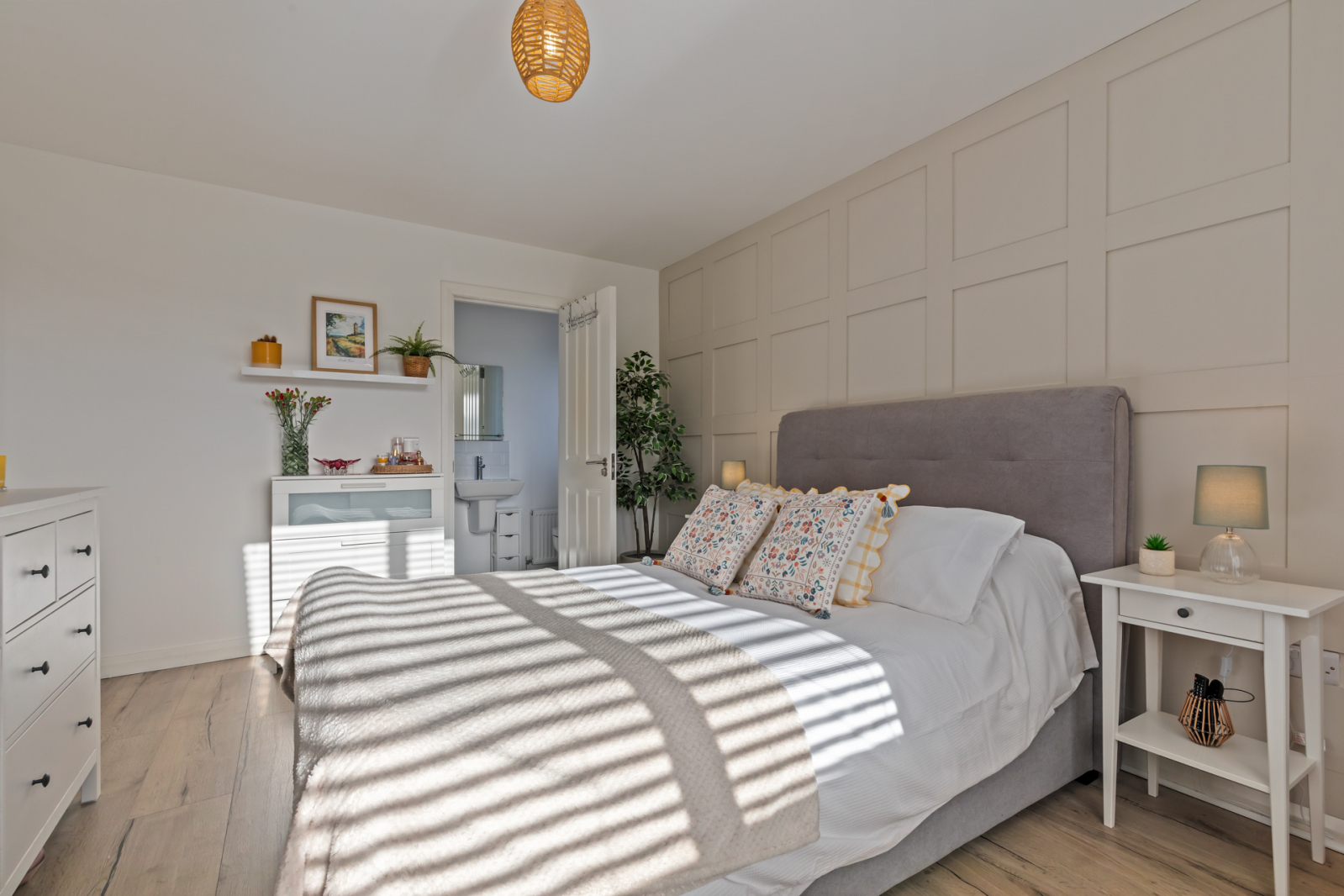 Feature paneled wall, laminate wooden flooring and views over communal green area.