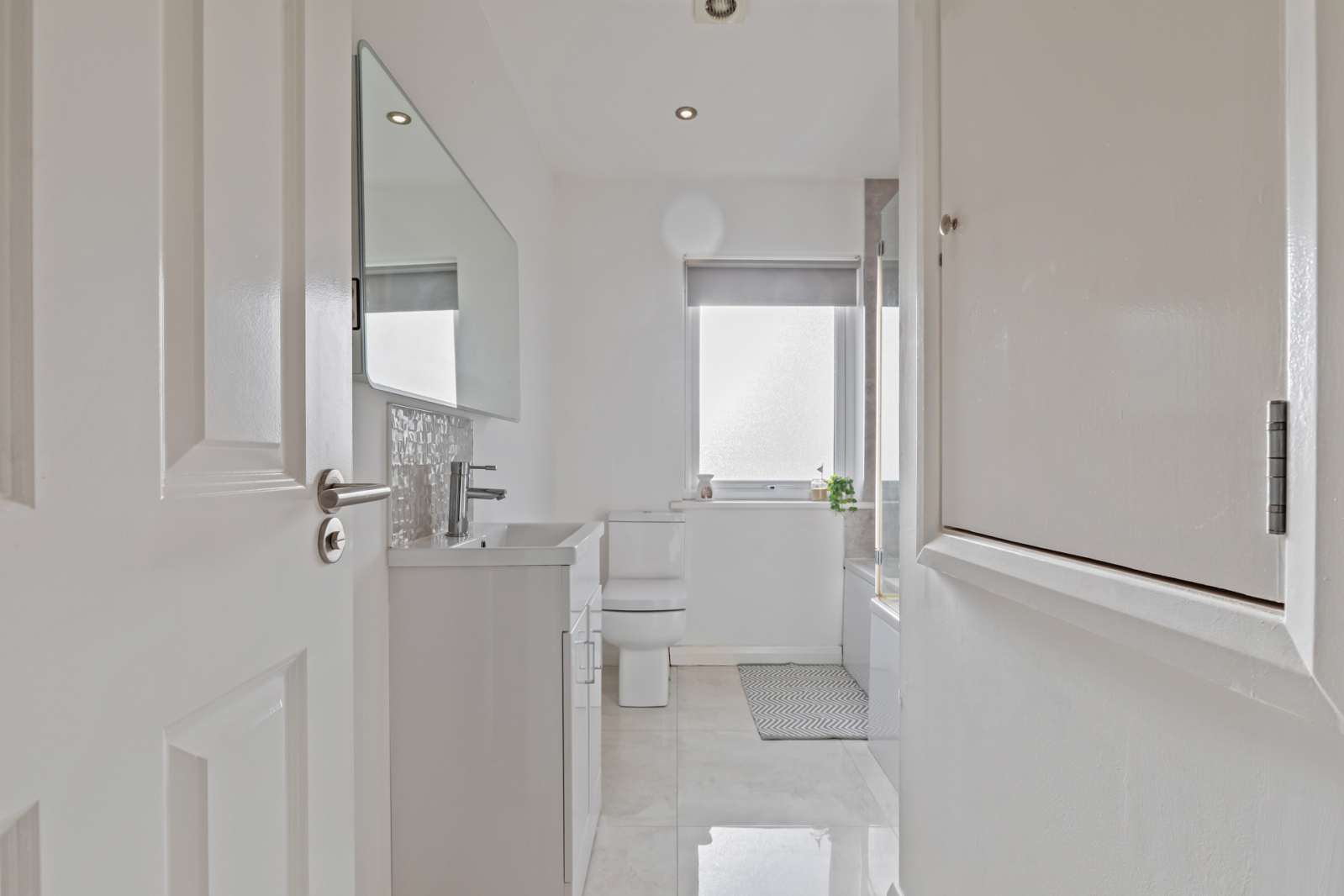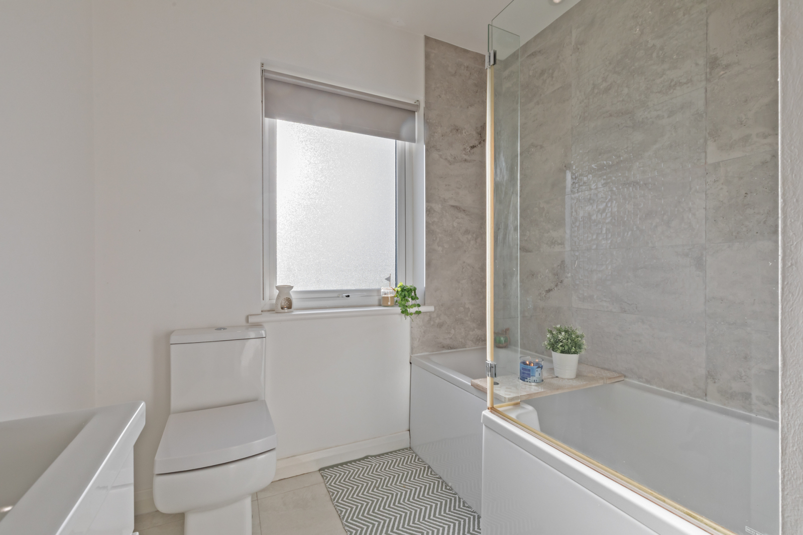 Comprises of paneled bath with overhead shower, mixer taps and shower screen. Low flush WC, ceramic bowl sink unit with vanity storage underneath. Chrome heated towel rail, recessed lighting, extractor fan, tiled floor and storage cupboard.