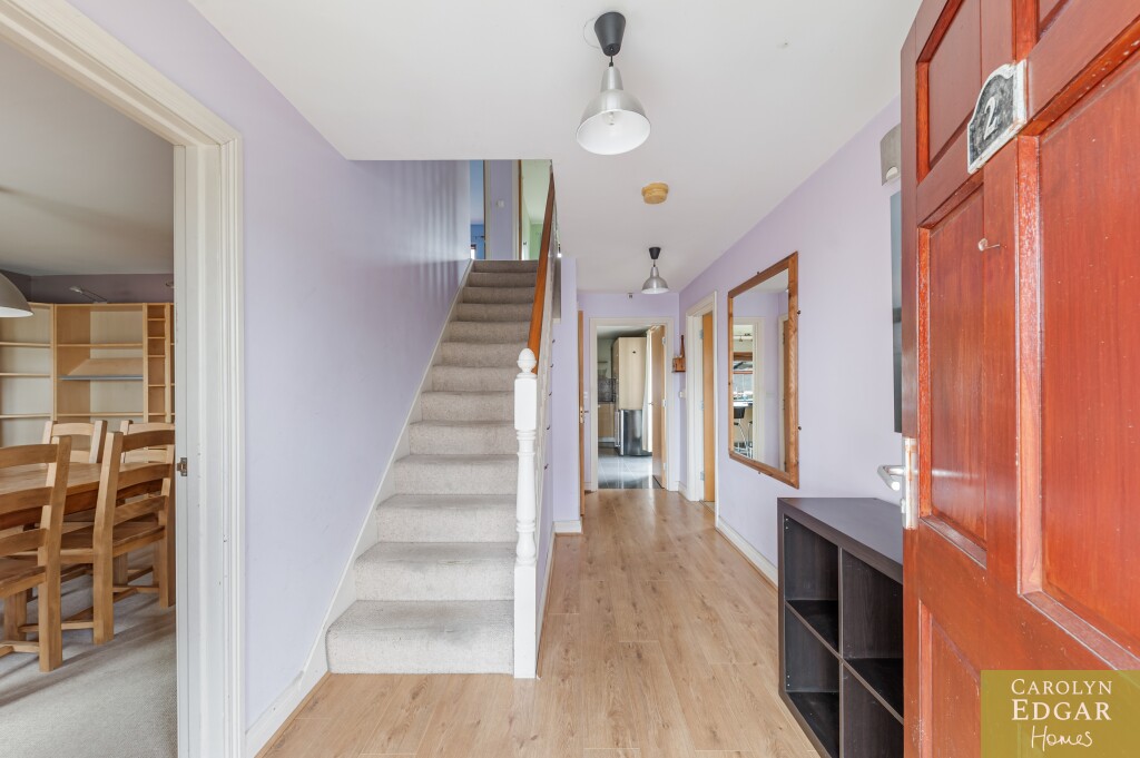 Internally, the property features a bright and welcoming entrance hallway leading to two reception rooms, one of these rooms is currently utilized as a dining room, while the other as a spacious dual aspect lounge, flooding with plenty of natural light, featuring a wood-burning stove and French doors opening onto sun terrace that overlooks the sunny rear gardens. The modern fitted kitchen includes an ample range of built-in units and appliances and a stylish central island, complemented by a utility room and a convenient downstairs bathroom.