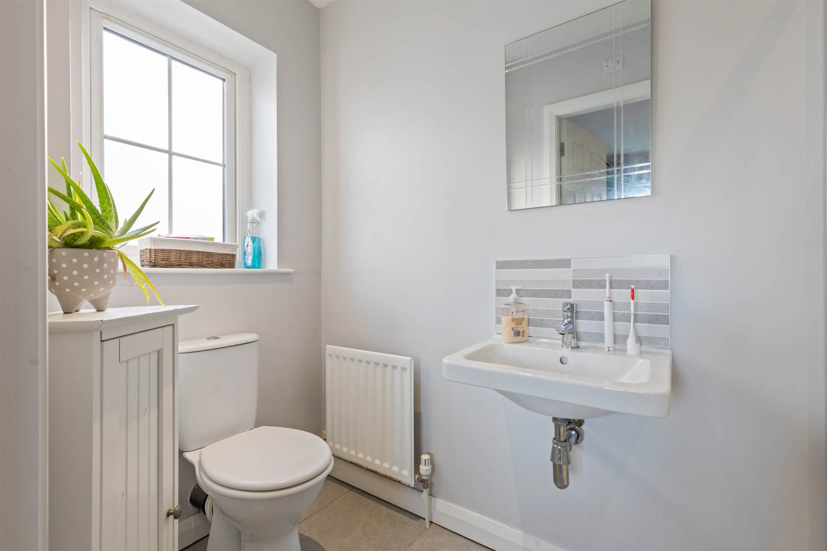 Two piece white suite comprising wall-mounted wash hand basin with mixer tap and tiled splashback, low flush WC, extractor fan, recessed lighting, ceramic tiled foor.