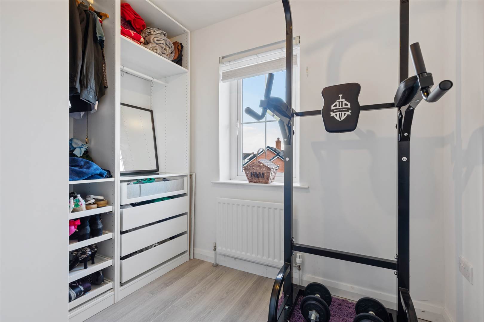 Built-in single wardrobe with rail. Additional open wardrobe with range of shelving and rails. Laminate flooring.
