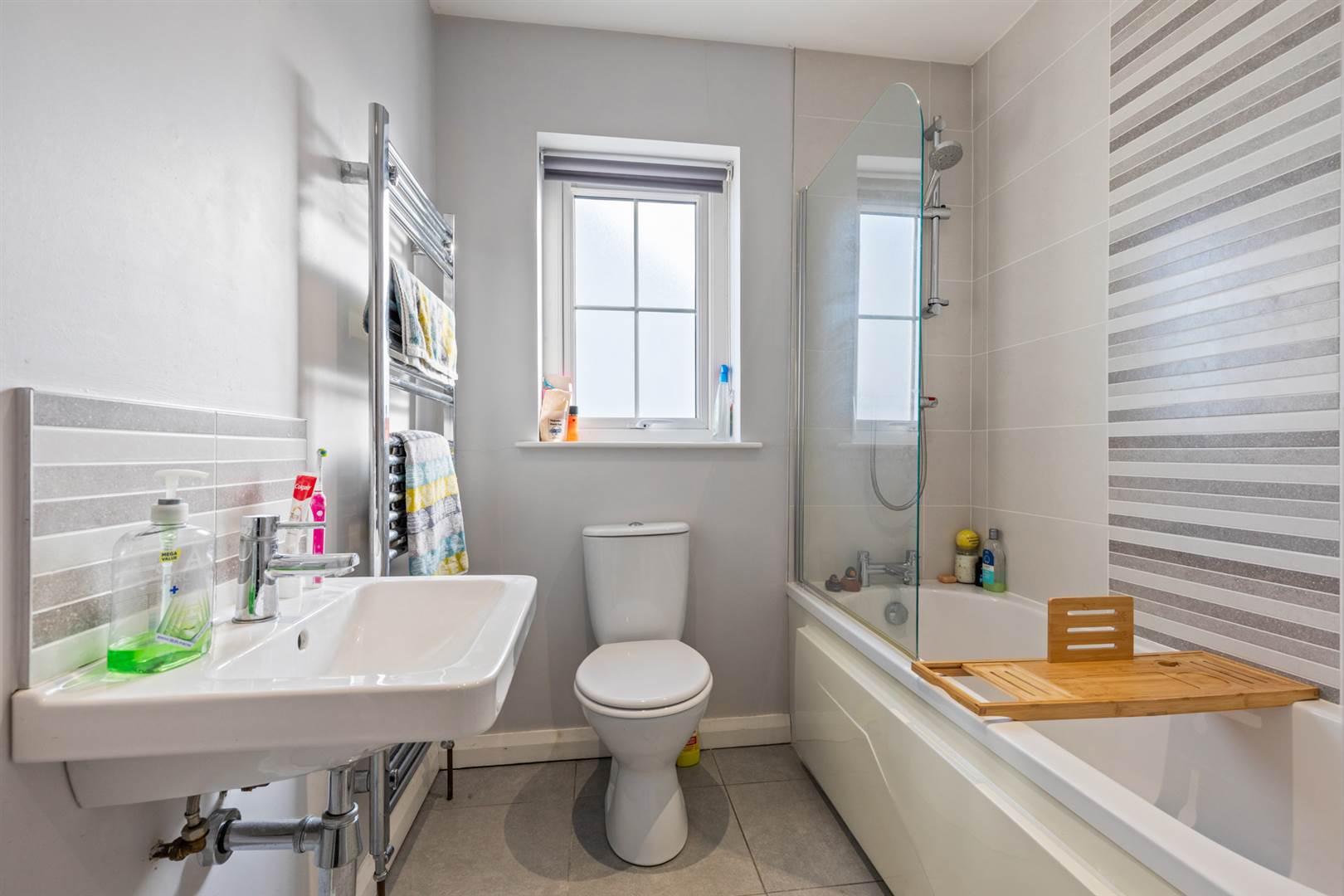 Three piece white suite comprising panelled bath with mixer tap and thermostatically controlled shower attachment over, semi pedestal wash hand basin with mixer tap and tiled splashback, low flush WC, ceramic tiled floor, part-tiled walls, extractor fan, recessed lighting.