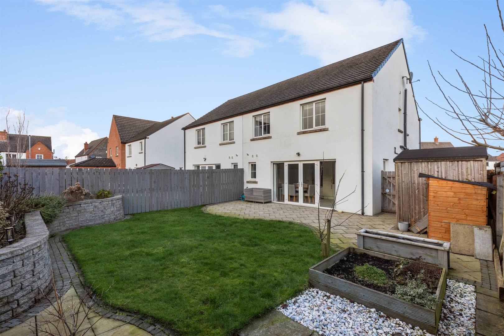 Fence enclosed rear garden laid in patio area, lawn and raised flowerbeds with timber shed and outside tap. To the front is a tarmac driveway with parking for several cars and garden laid in lawn.