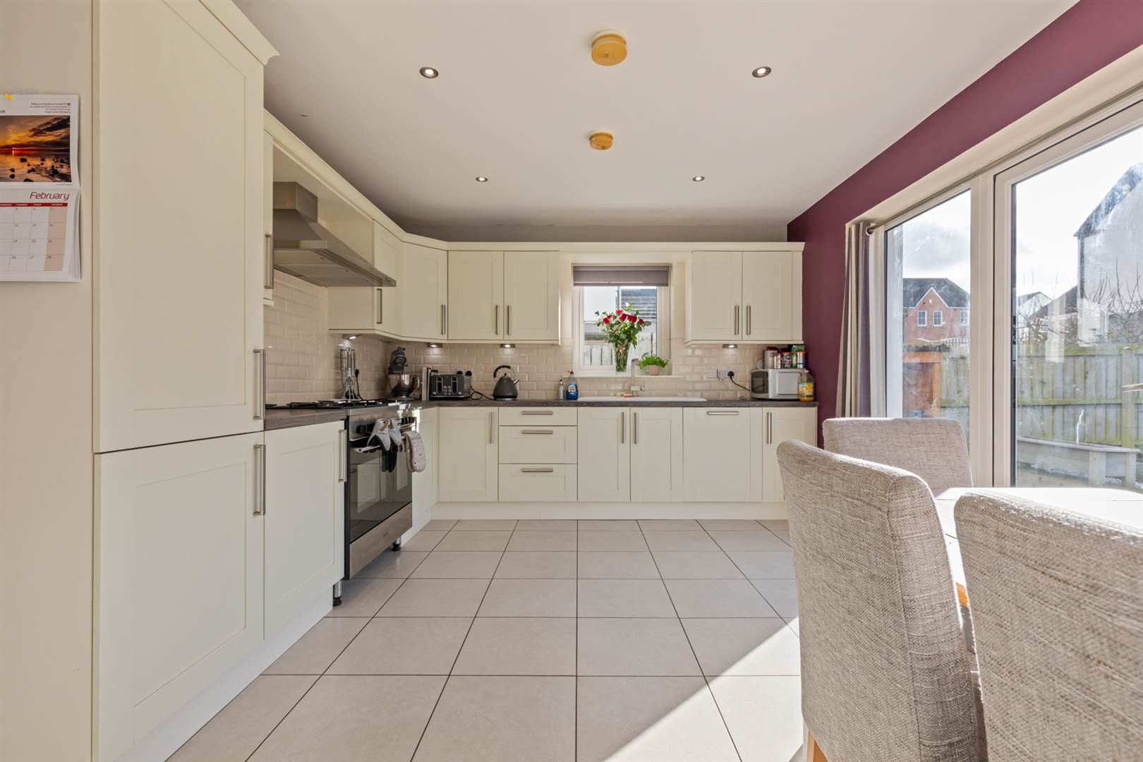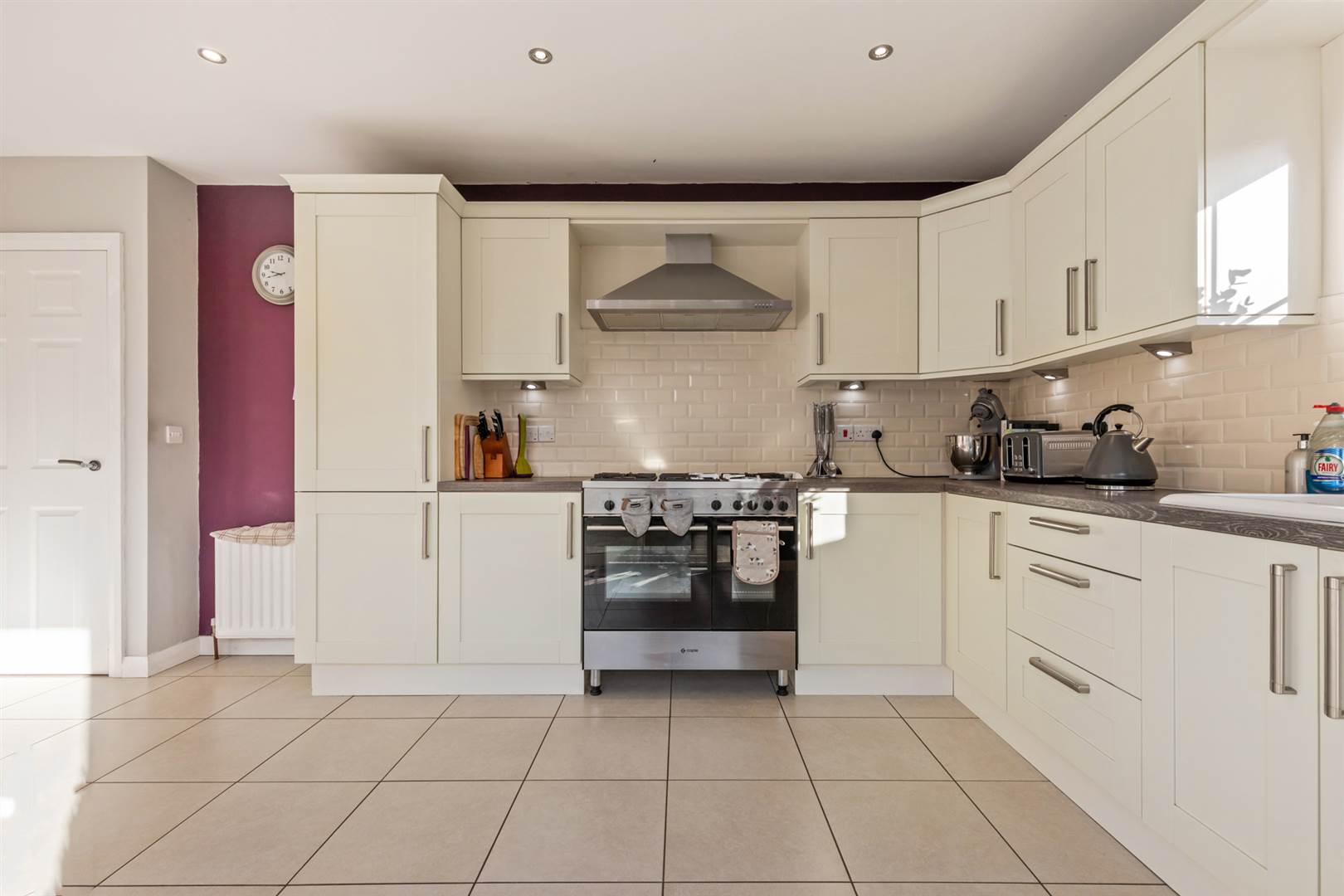 Excellent range of cream shaker style units with wood effect laminate worktops, Caple dual fuel range cooker with five ring gas hob and double electric oven and stainless steel extractor fan above, integrated dishwasher and fridge freezer, 1.5 bowl sink unit with single drainer and mixer tap, rescessed lighting, part tiled walls, ceramic tiled floor, double glazed double doors to garden, door to: