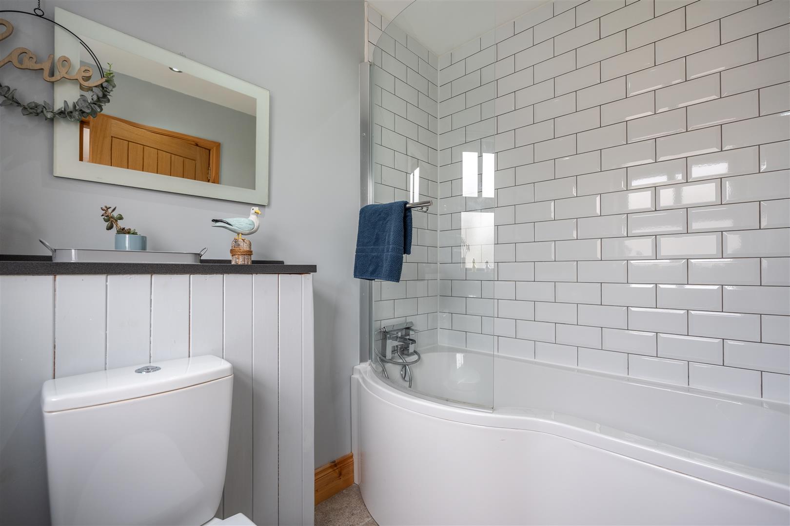 Stunning white suite comprising curved panelled bath with pillar mixer taps and telephone shower attachment; curved glass shower screen; close coupled WC; corner pedestal wash hand basin with mono mixer tap; part tiled walls; tiled floor; recessed spotlights; extractor fan.