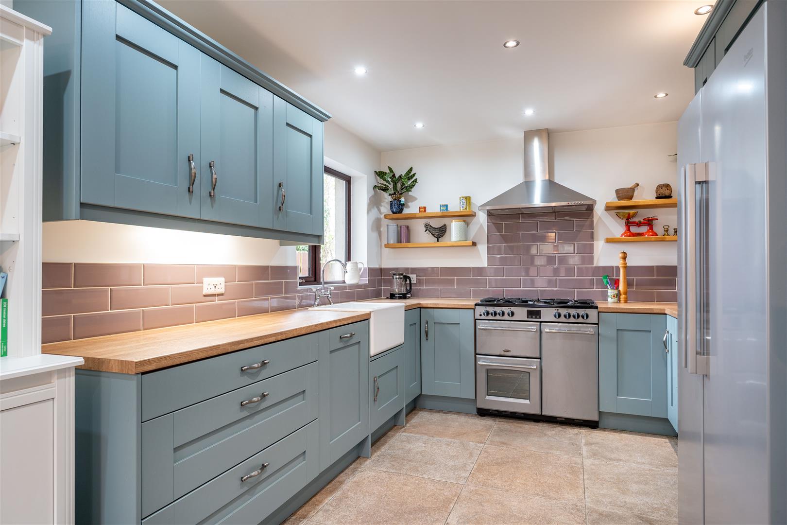 Superb range of contemporary fitted high and low level cupboards and drawers incorporating Caple recessed glazed sink unit with mixer taps; space for cooker; tiled splashback; extractor hood over; space and plumbing dishwasher; space for American style fridge / freezer; wood lamainate worktops; tiled floor; recessed spotlights; under cupboard lighting; glazed PVC double doors to patio and gardens; TV aerial connection point.
