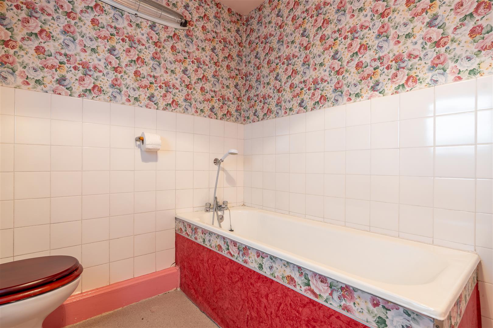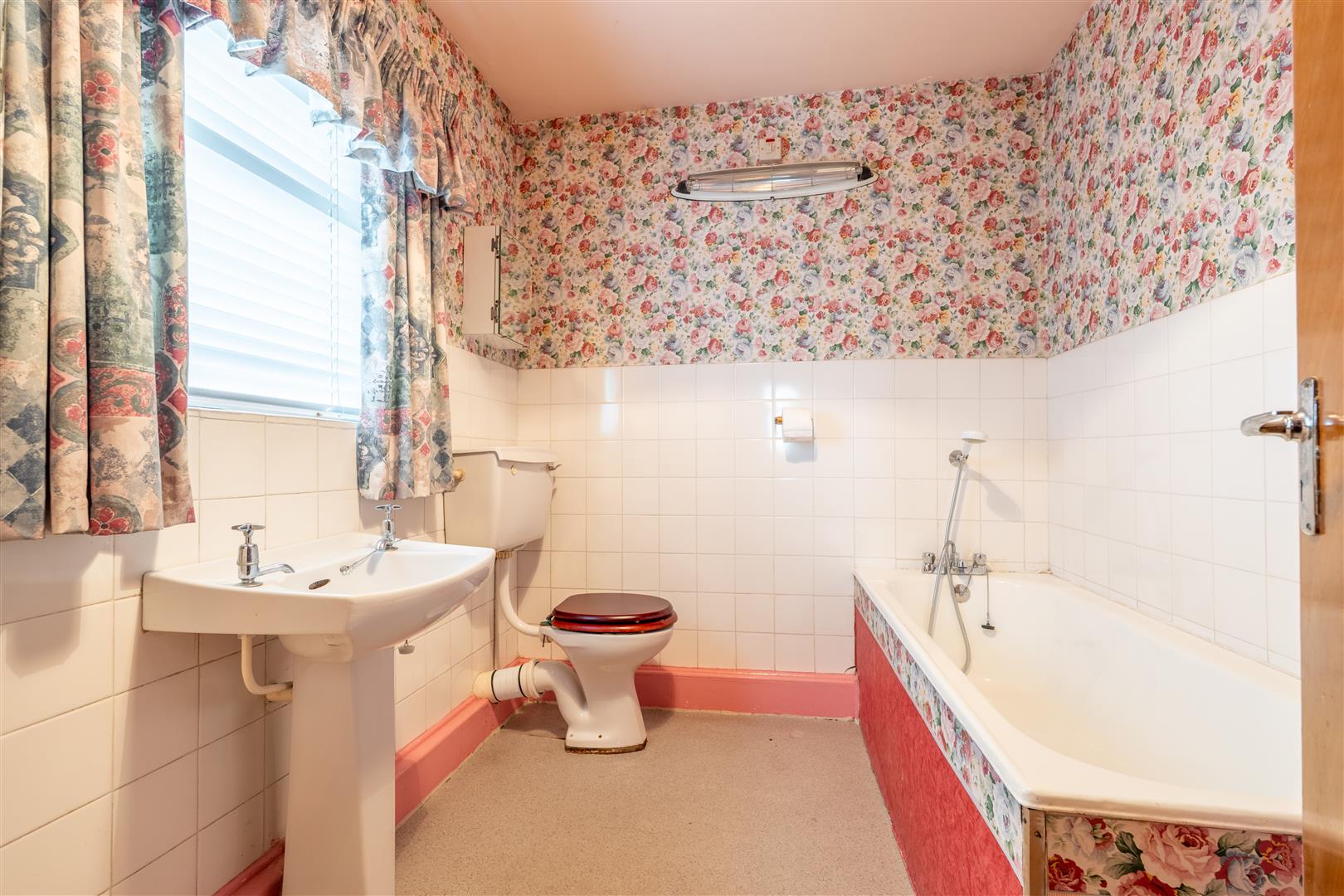 White suite comprising panelled bath, mixer taps and telephone shower attachment; pedestal wash hand basin; low flush WC; half tiled walls; electric wall heater; electric shaver socket.