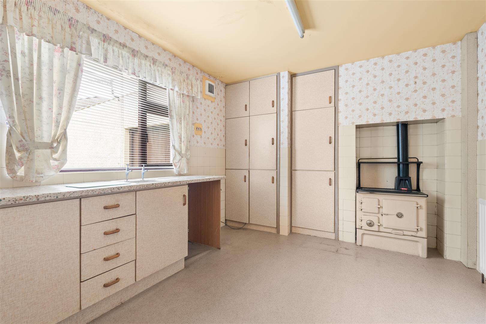 Single drainer stainless steel sink unit; range of laminate eye and floor level cupboards and drawers; formica worktops; Esse oil fired Range; fluorescent lighting; part tiled walls; extractor fan.