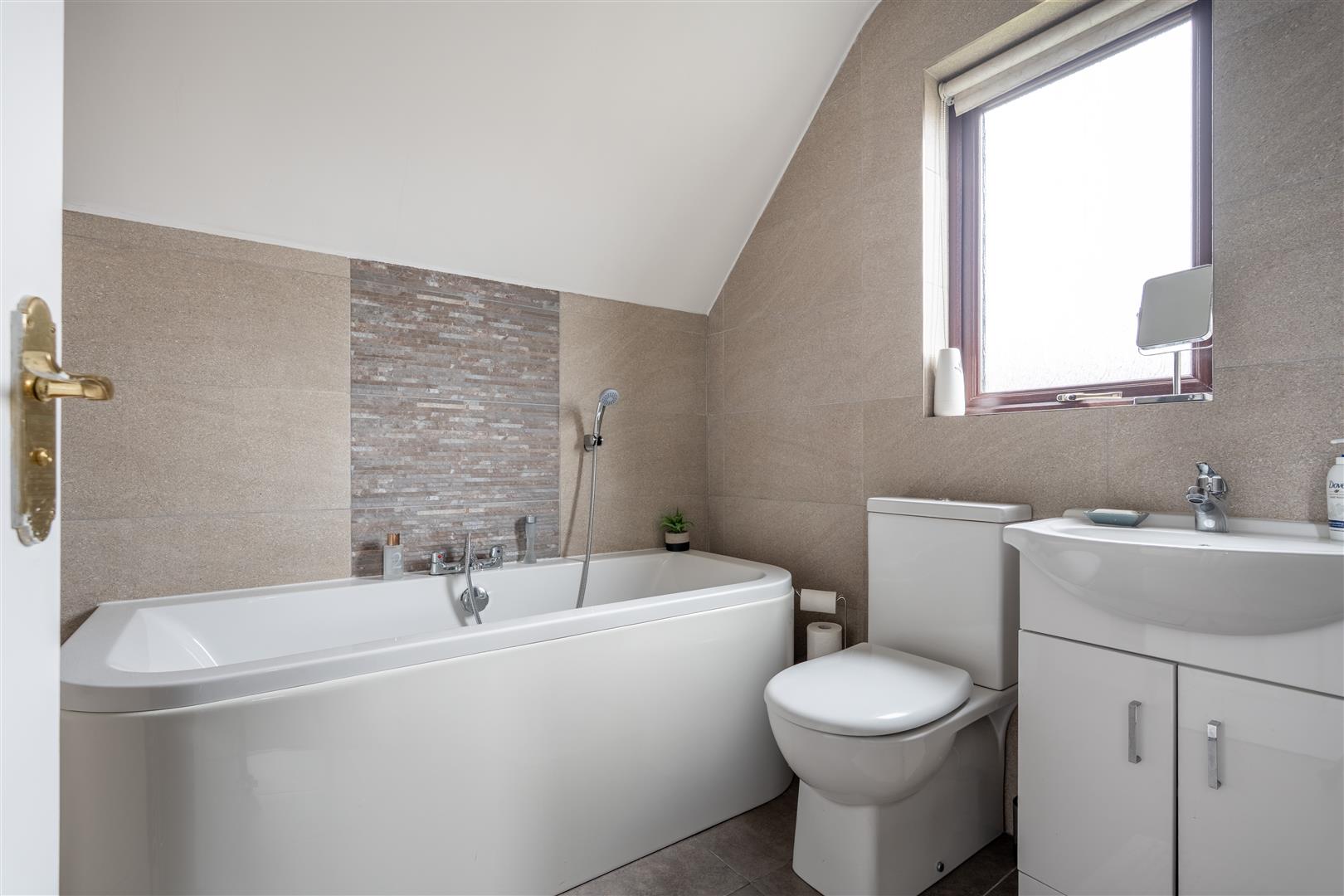 Modern white suite comprising freestanding panel bath with centrally located mixer taps and telephone shower attachment; close coupled WC; vanity unit with wash hand basin and mono mixer taps with cupboards under; tiled shower cubicle with folding glass shower door and side panel; thermostatically controlled shower; LED spotlights; tiled walls and floor; chrome heated towel radiator.