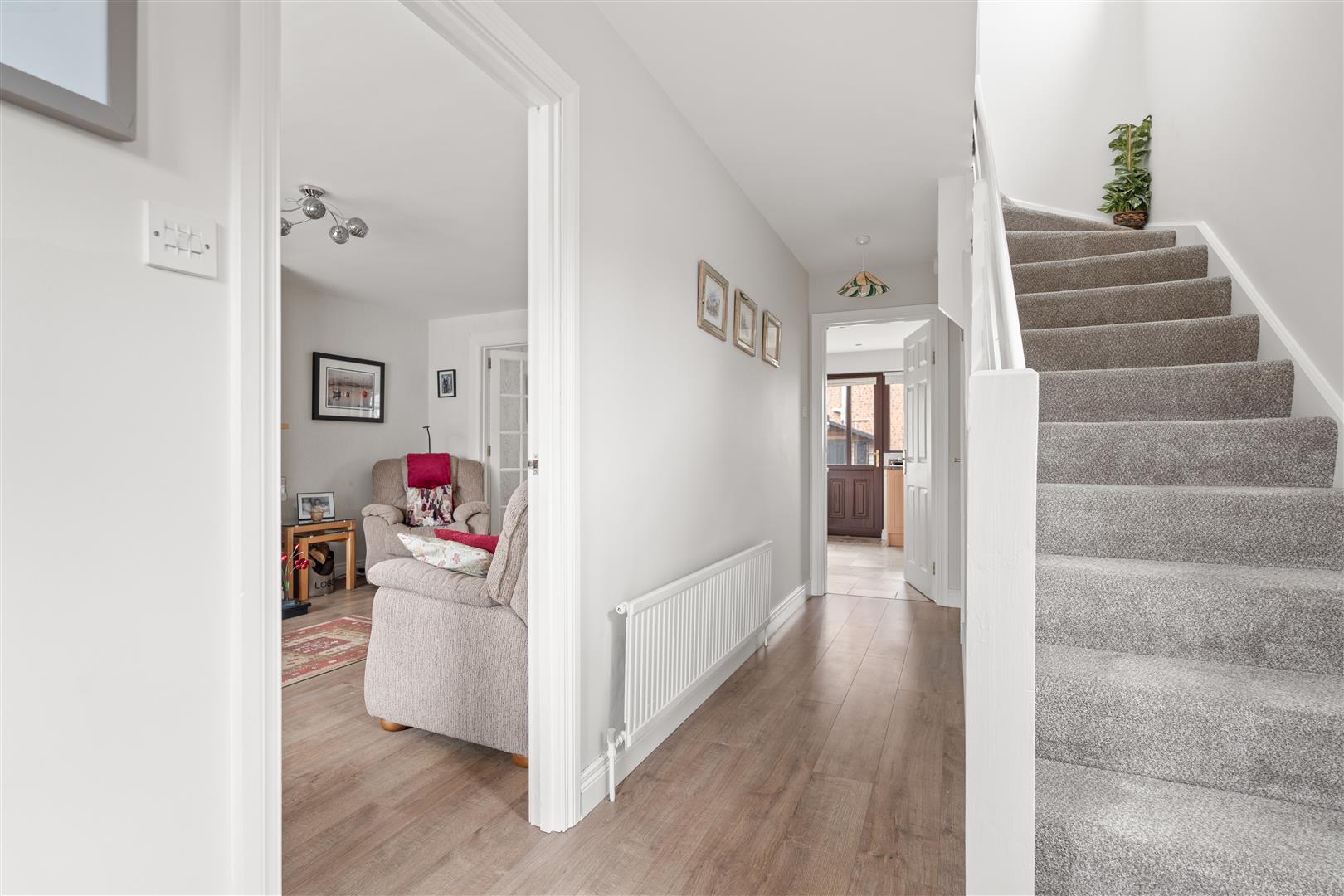 Glazed Upvc entrance door and matching side light; wood laminate flooring; understairs storage cupboard with Ideal gas fired boiler.