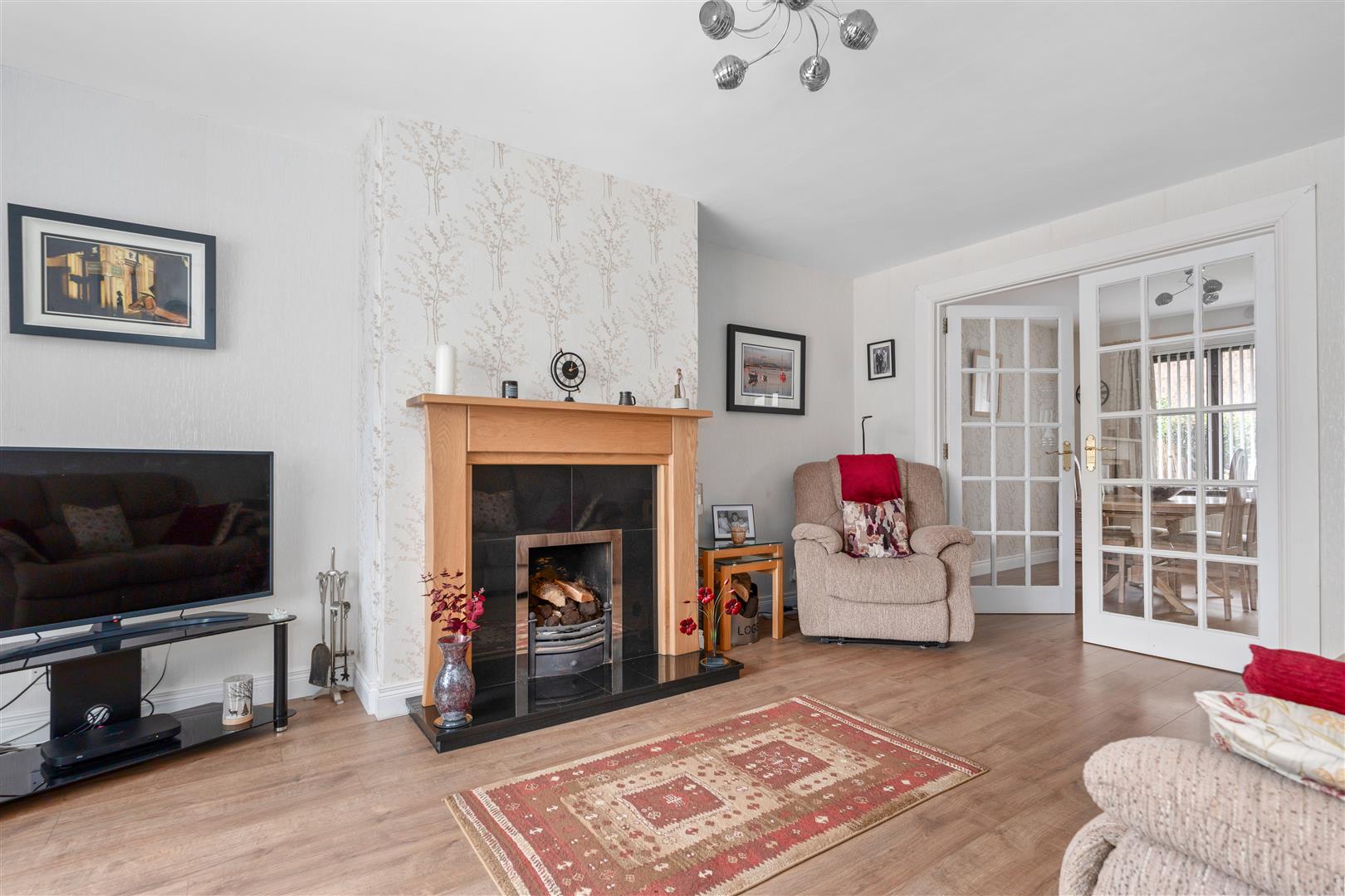 Black marble fireplace and matching hearth with hardwood surround; wood laminate flooring; TV aerial and telephone connection point; glazed double doors through to:-