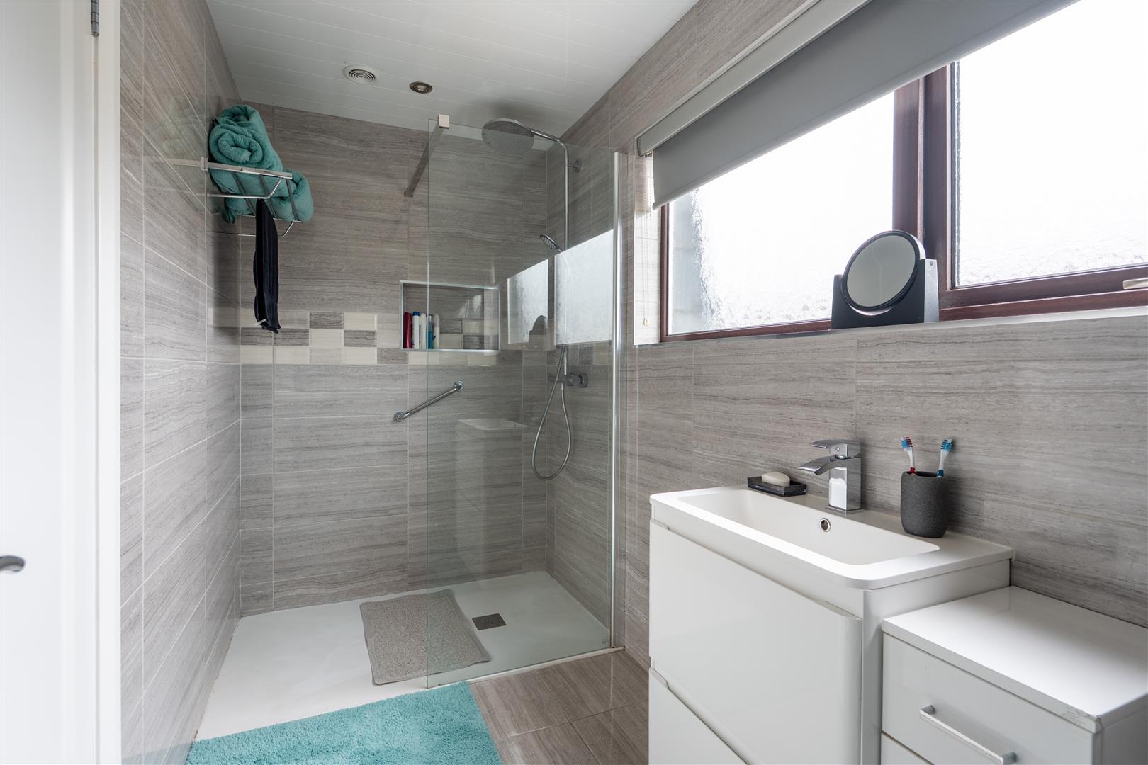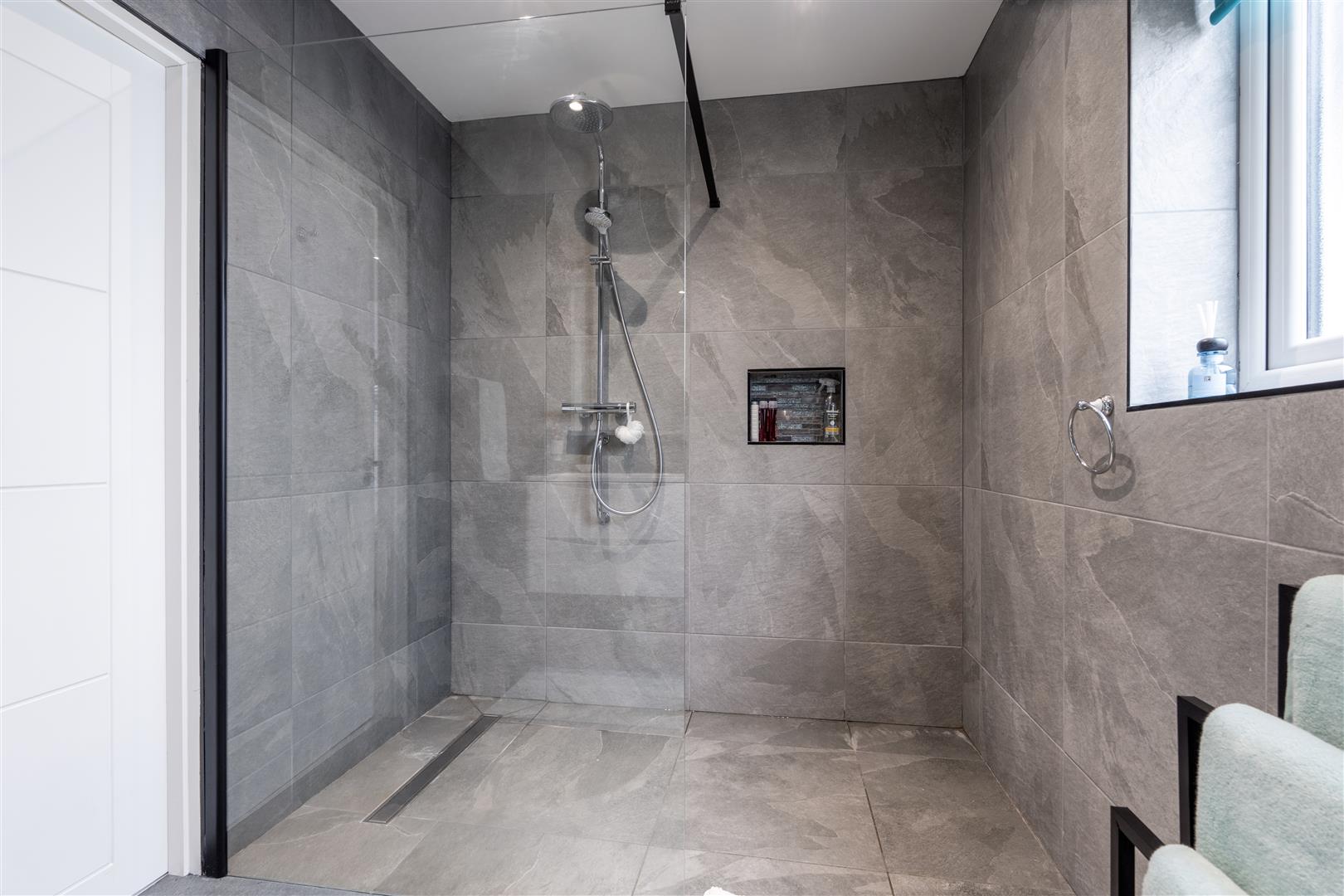 Stunning white suite comprising walk in shower area with thermostatically controlled shower unit and wall mounted telephone shower attachment; drench shower head over; glass shower screen; wc with concealed cistern; wall mounted wash hand basin with mono mixer taps and vanity unit under; tiled walls and floor; recessed spotlights; PVC tongue and groove ceiling; towel radiator; extractor fan.