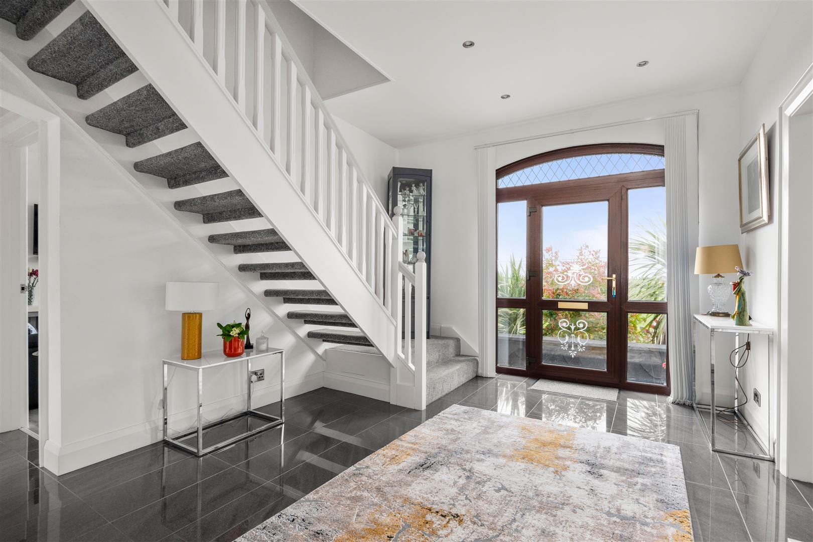 Glazed PVC entrance door with matching sidelights; tiled floor; recessed spotlights; glazed double doors to:-
