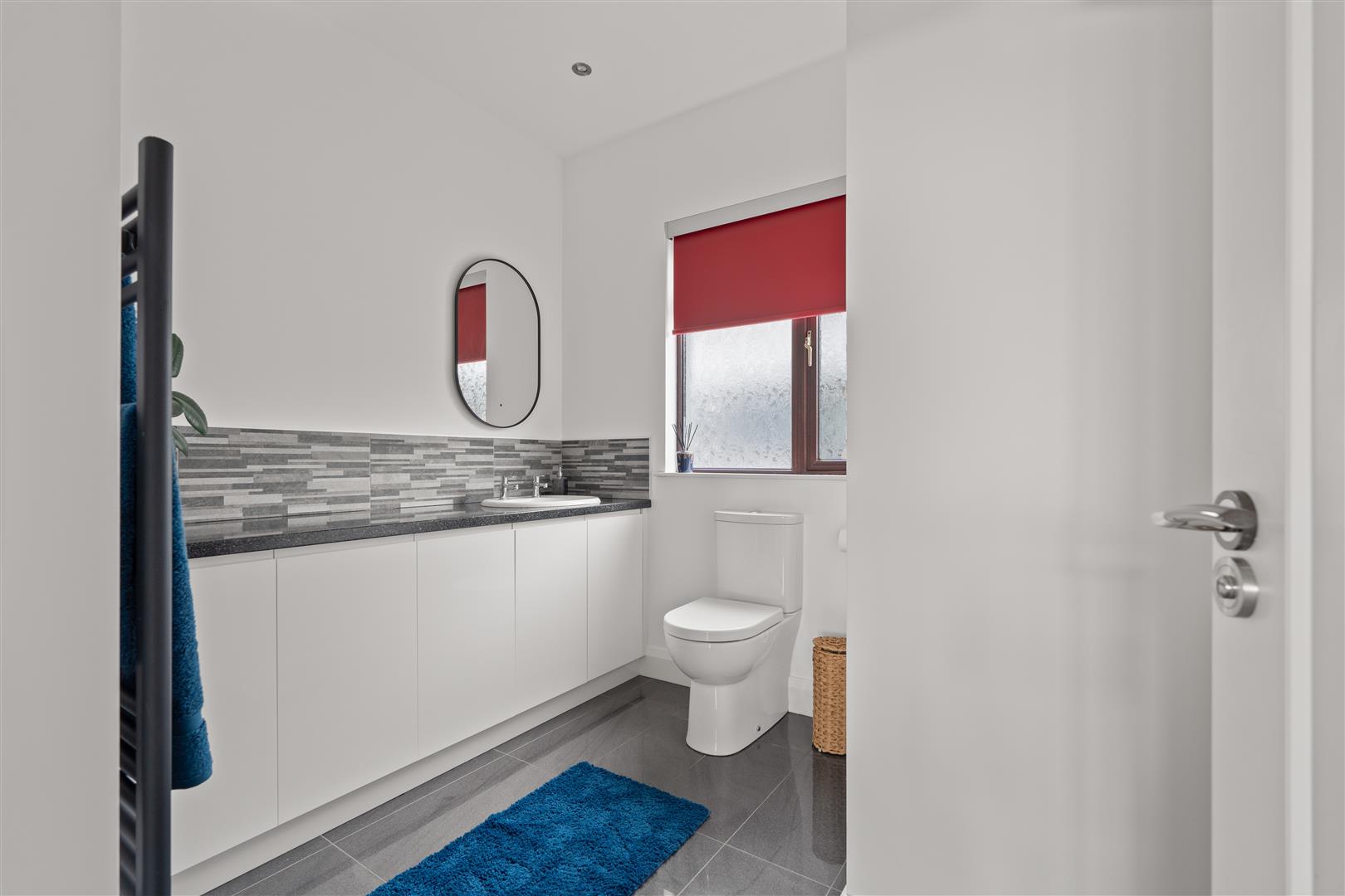 Modern white suite comprising close coupled WC; recessed wash hand basin with chrome taps; built in cupboards; tiled splashback; towel radiator; recessed spotlights; tiled floor.
