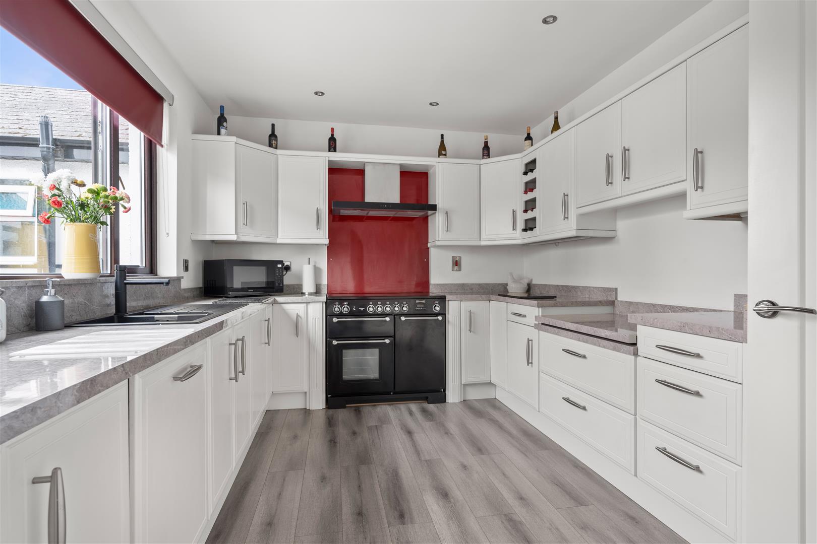 Excellent range of painted finish high and low level cupboards and drawers with matching wine rack incorporating 1½ tub sink unit with mono mixer taps; Rangemaster range cooker with 5 ring ceramic hob; extractor hood over; integrated Hotpoint fridge and Beko dishwasher; Marble effect granite worktops with matching upstands and pull out breakfast bar; under cupboard lighting; recessed spotlights; wood laminate floor; open through to:-