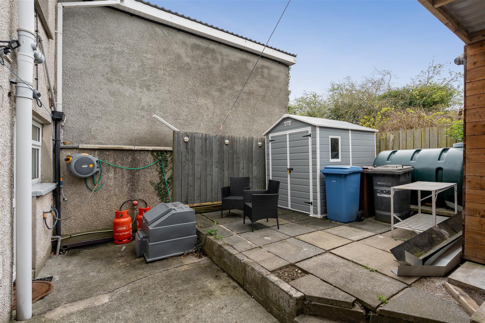 Enclosed rear garden with raised flagged patio area; outside light and water tap; oil storage tank.
