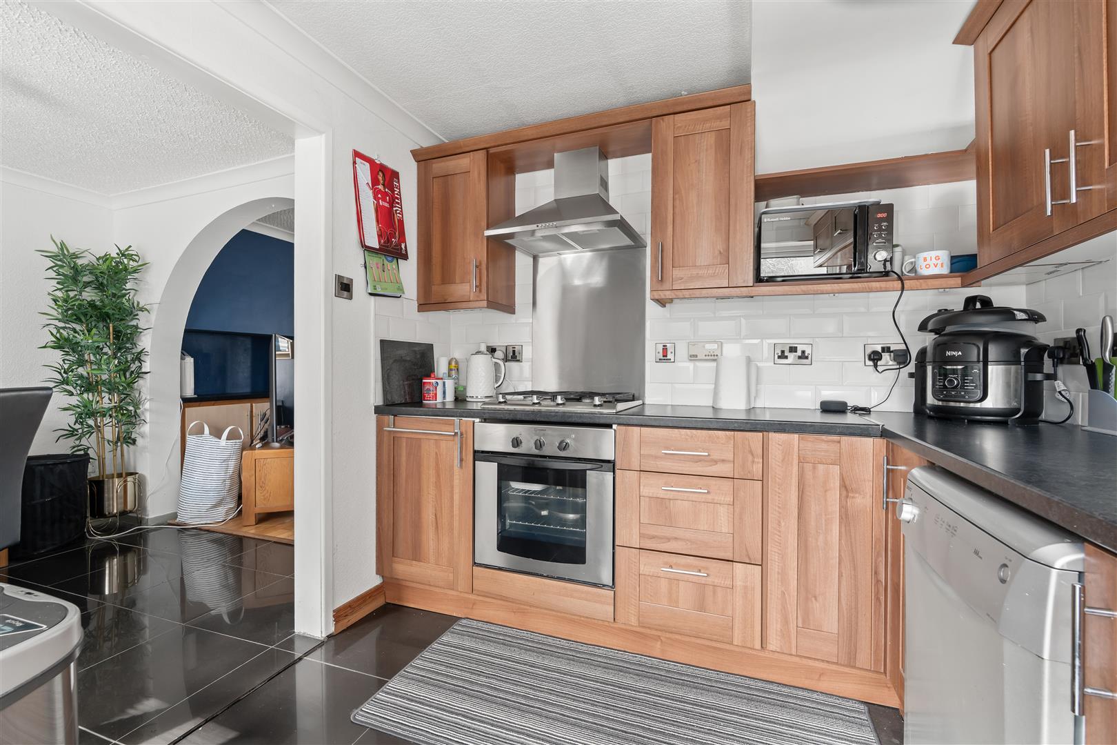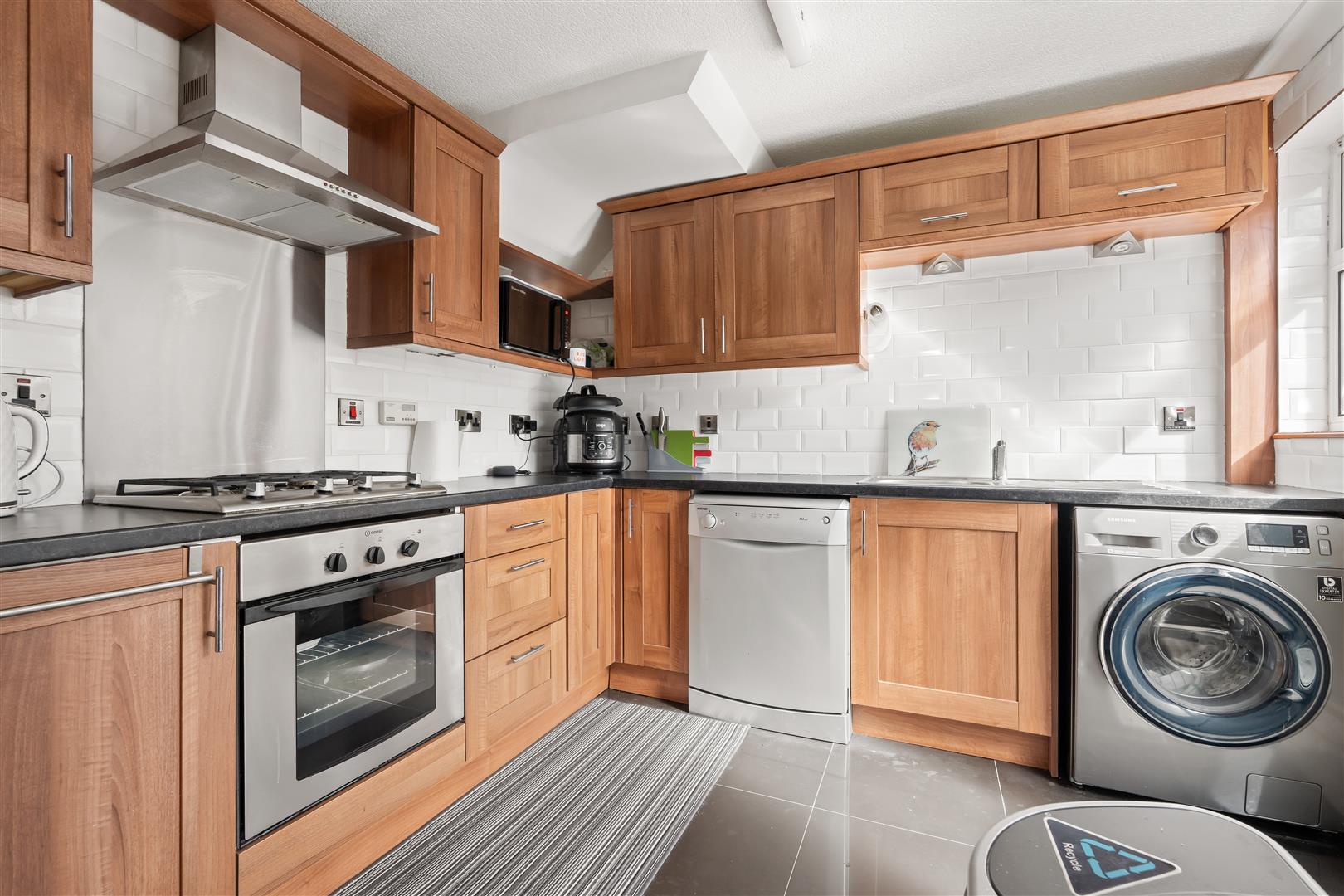 Good range of high and low level worktops incorporating single drainer stainless steel sink unit with swan neck mixer taps; Indesit electric oven; Indesit 4 ring gas hob with stainless steel splashback and stainless steel extractor unit with light over; space and plumbing for washing machine and dishwasher; tiled splashback; ceramic tiled floor; door to rear gardens.