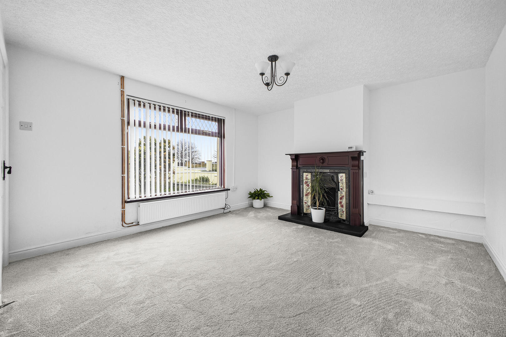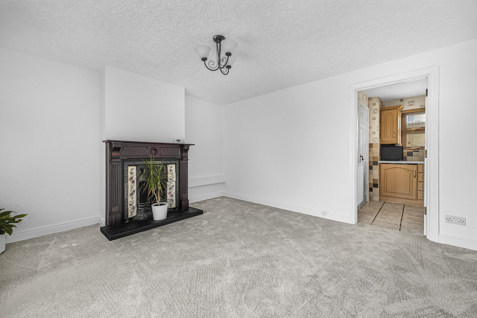 Outlook to the front, newly laid carpet, feature open fire with wooden surround, tiled hearth and cast-iron inset