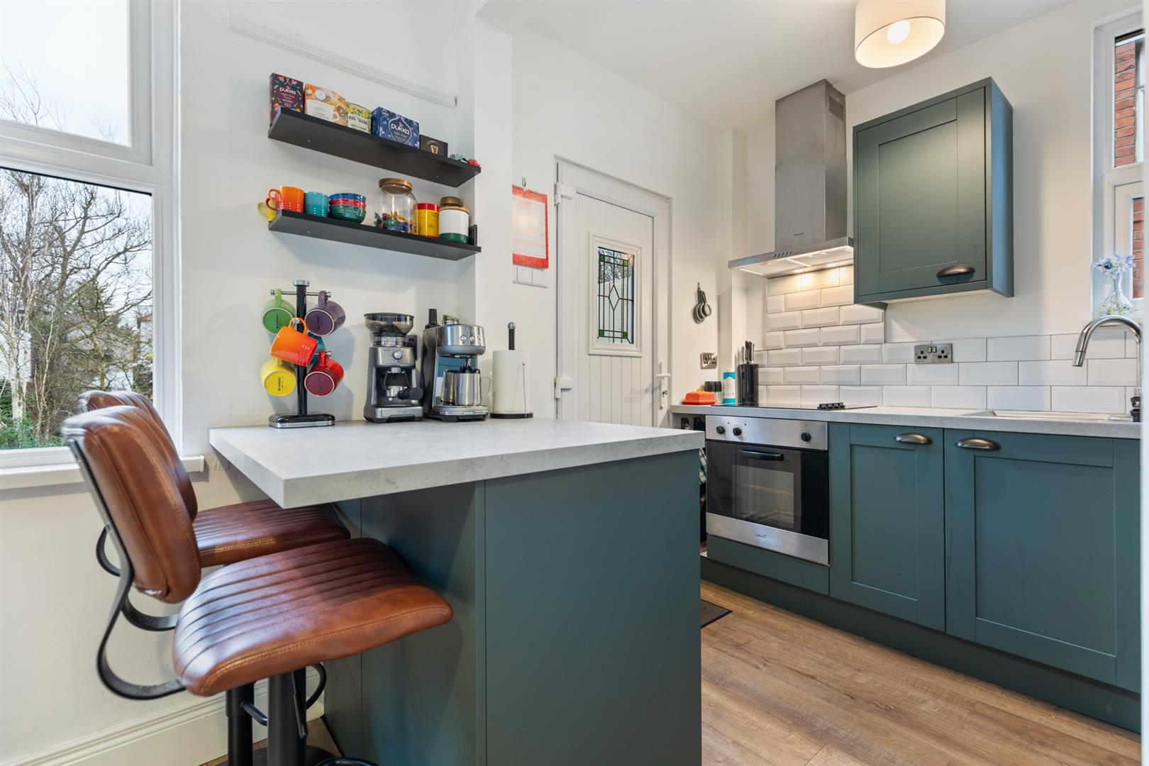 Modern range of high and low level units with matching breakfast bar, single drainer stainless steel sink unit with mixer tap. Integrated fridge/freezer, built in stainless steel oven and ceramic hob. Part tiled walls, laminate wood flooring, PVC door to rear.