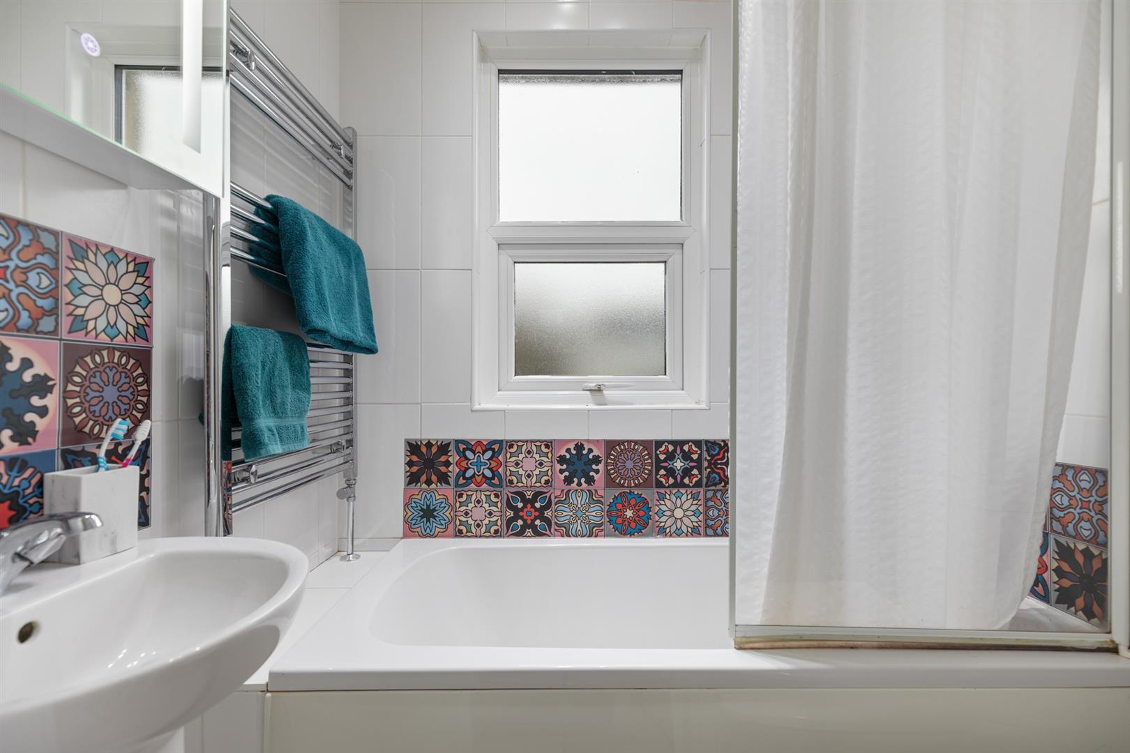 White suite comprising: Panelled bath with telephone hand shower, low flush WC, pedestal wash hand basin with mixer tap. Feature chrome wall mounted radiator, fully tiled walls, fully tiled floor.