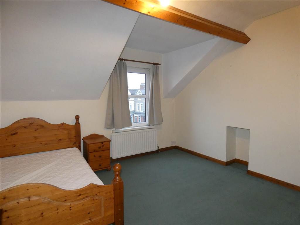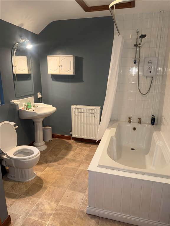 Double panelled radiator, white suite comprising, low flush w.c., pedestal wash hand basin, panelled bath with 'Mira' electric shower over, cupboard containing copper cylinder, immersion heater, access to roof space.